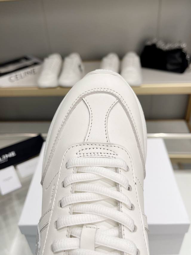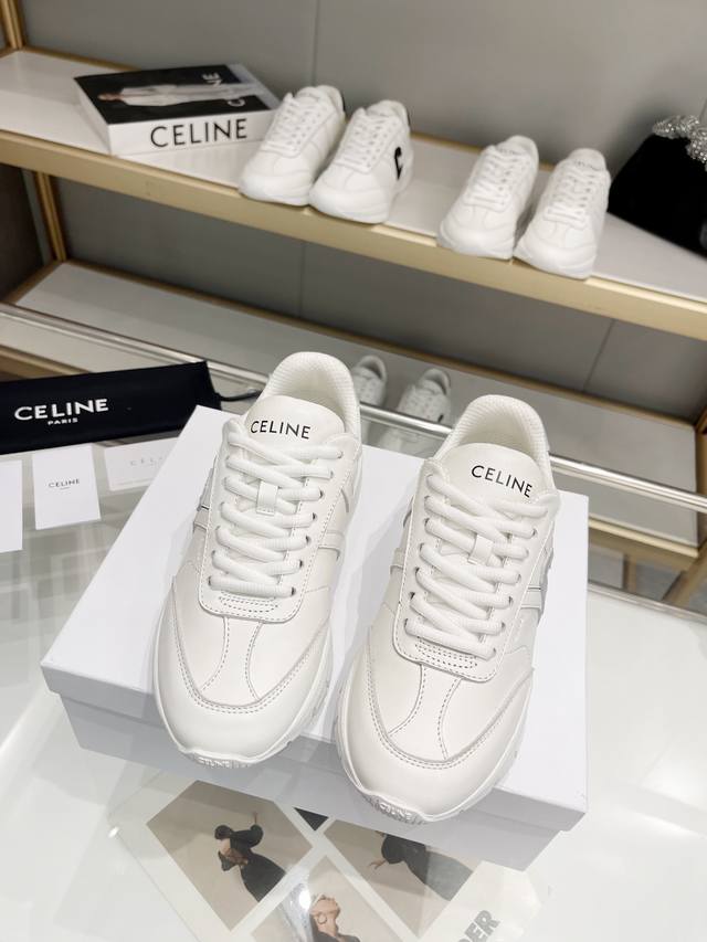 原版购入开发 做货 Celine Runner CR-02运动鞋现 沿袭了Hedi的都市运动风。经典的小白鞋外观,百看不厌。为了不让鞋身单调,鞋侧和鞋头区域还有着部分纹路,将鞋身划分开来。三种不同的Celine标识分别显示在鞋舌 Celine 、鞋侧 C字母 和后跟 凯旋门 三处。黑色和白色形成了强烈的反差
