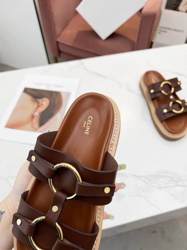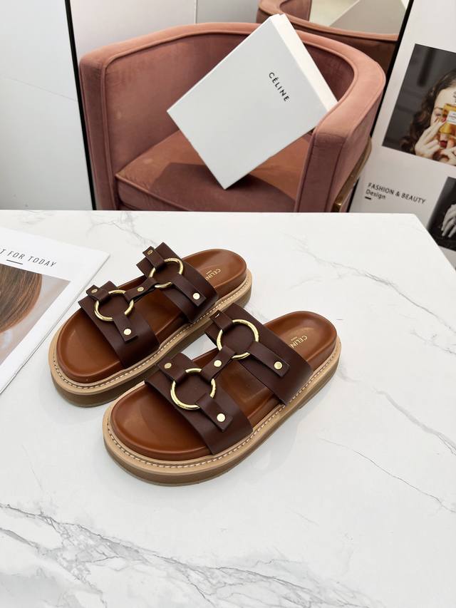 CELINE 赛琳 2024春夏新品凉鞋五金扣饰原版1:1定制鞋面采用全油边工艺,楦形流畅完美,上脚百搭舒适