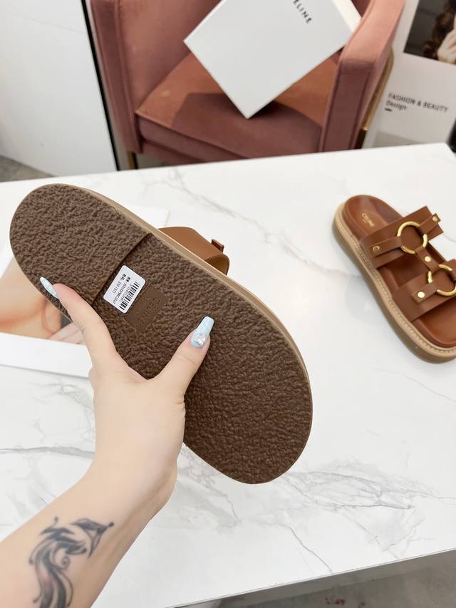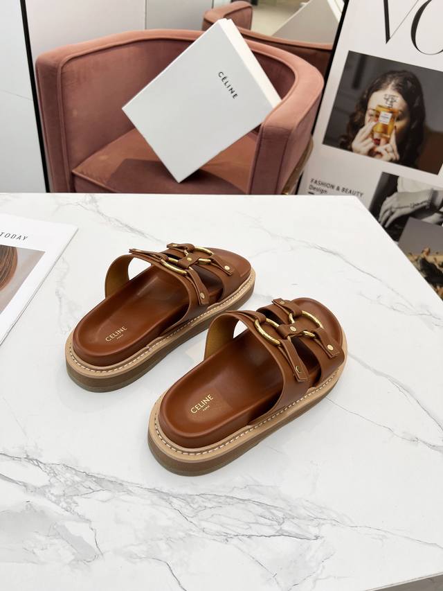 CELINE 赛琳 2024春夏新品凉鞋五金扣饰原版1:1定制鞋面采用全油边工艺,楦形流畅完美,上脚百搭舒适