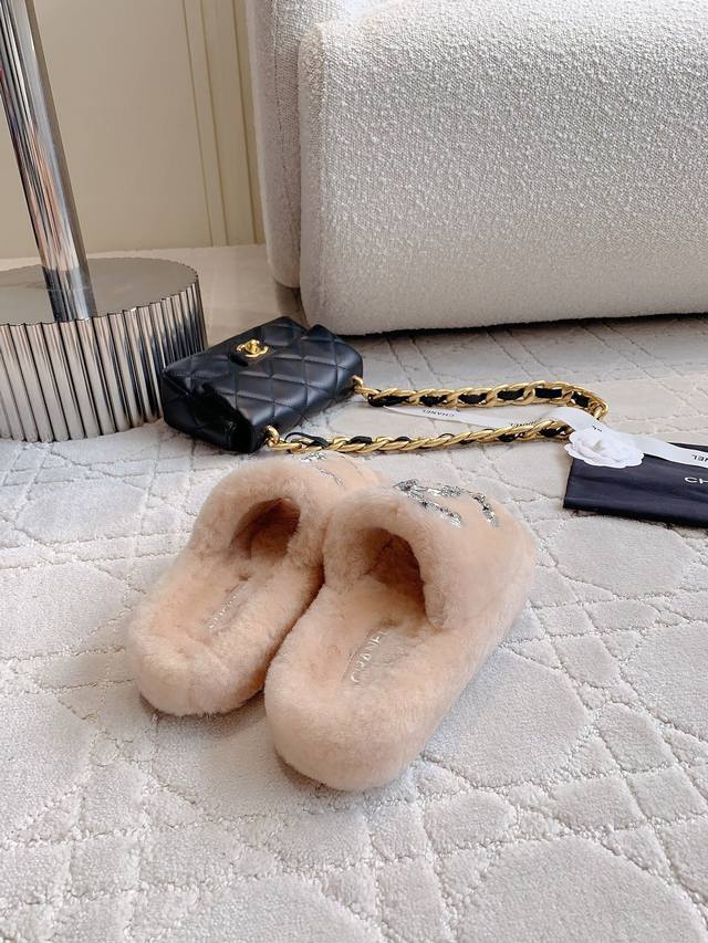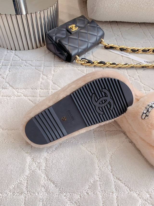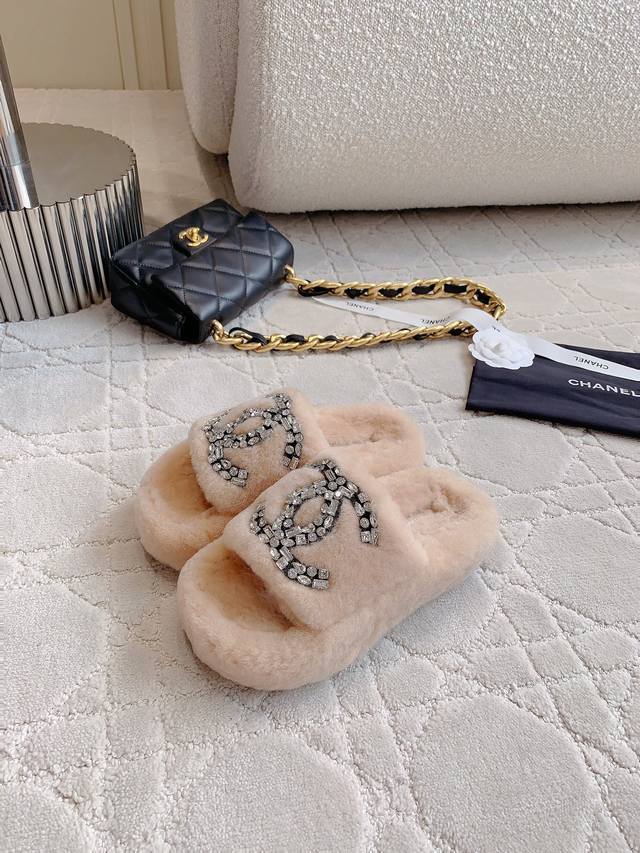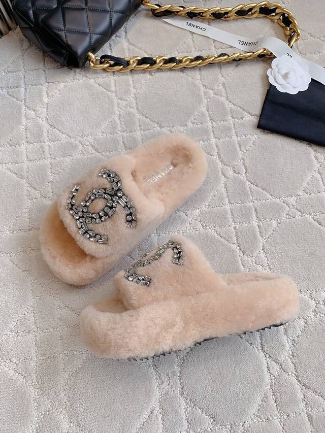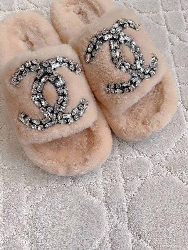 Chane*新款毛毛水钻拖鞋 超级厚实的澳洲进口羊毛 犹如踩在云朵般的感觉 超级舒适 经典百搭款
