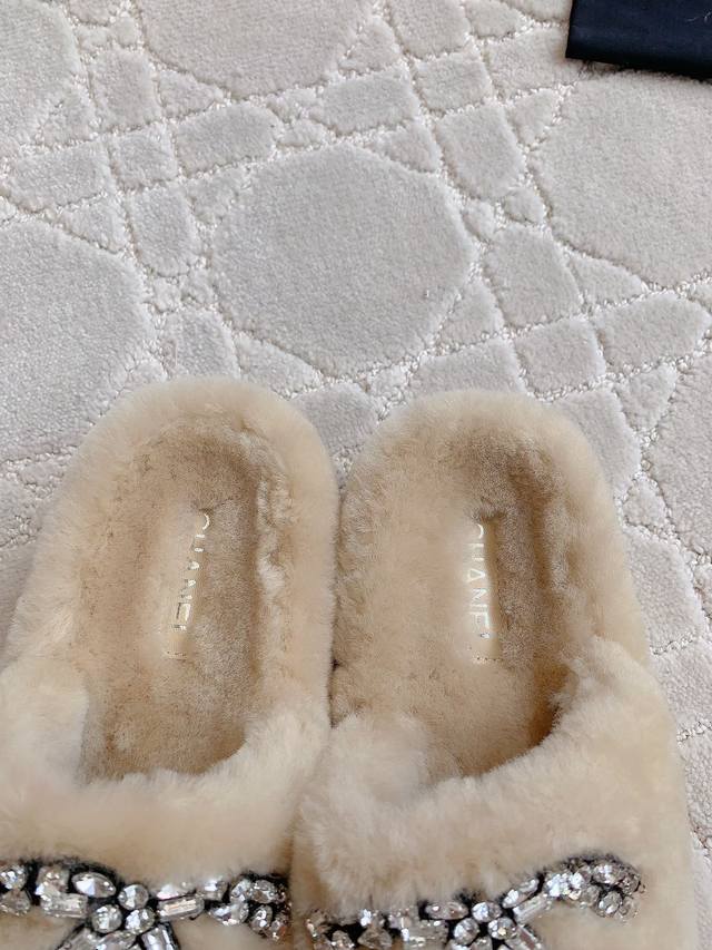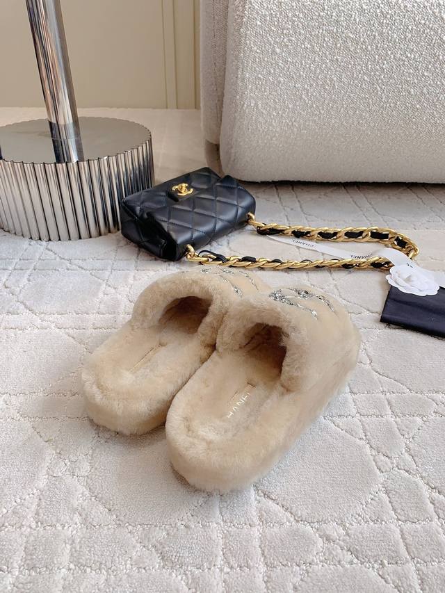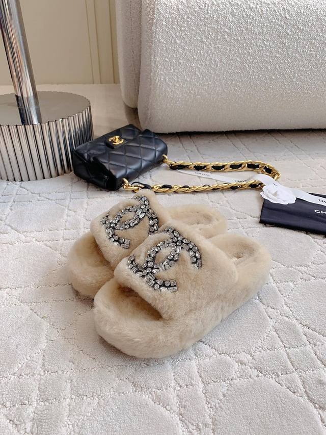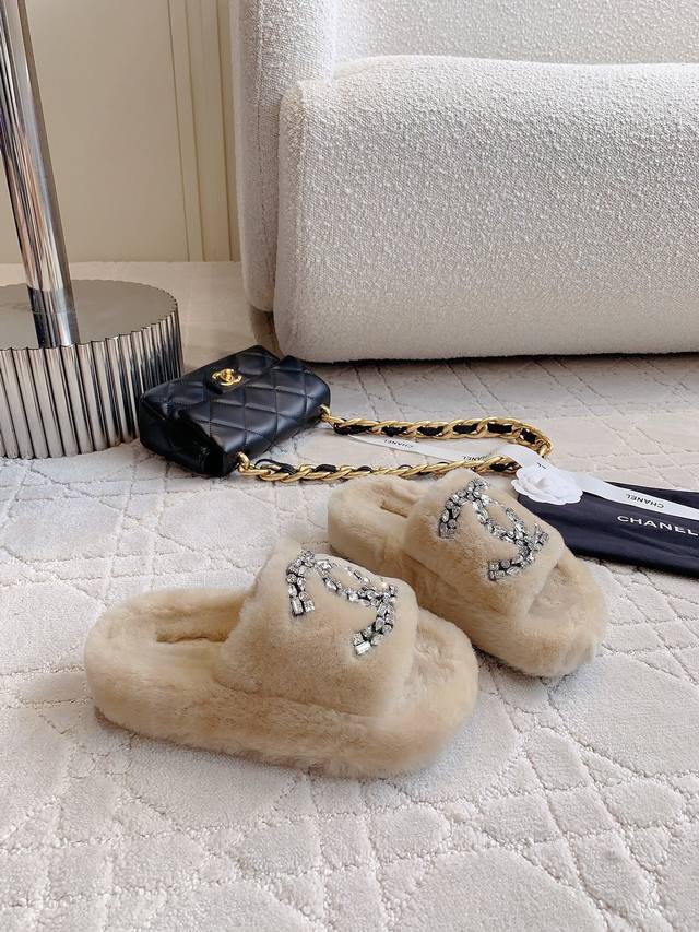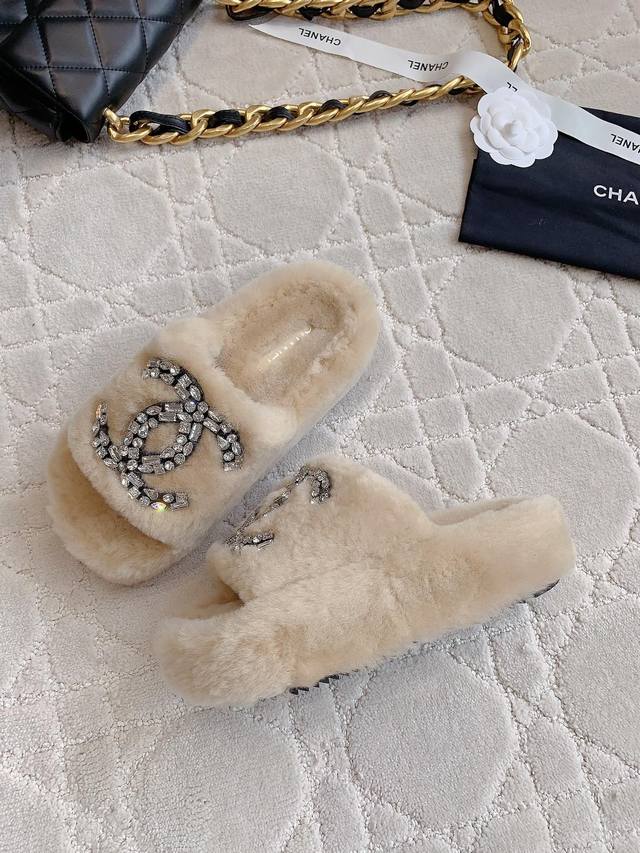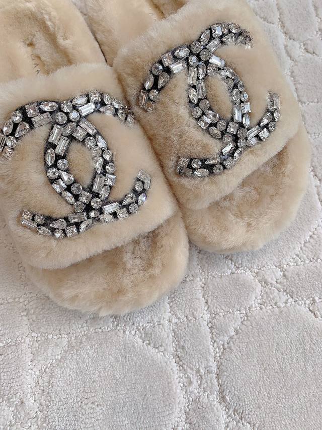 Chane*新款毛毛水钻拖鞋 超级厚实的澳洲进口羊毛 犹如踩在云朵般的感觉 超级舒适 经典百搭款