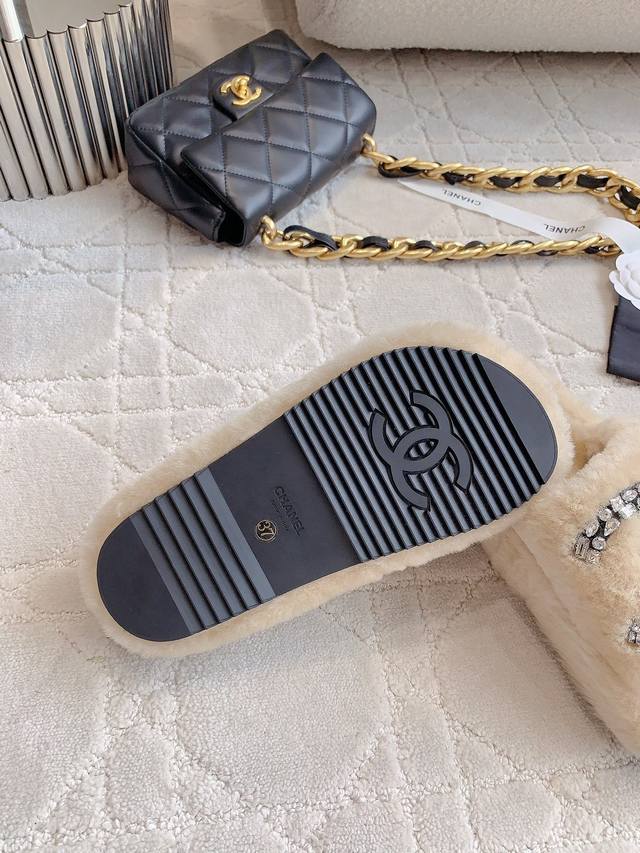 / 出厂价Chane*新款毛毛水钻拖鞋 超级厚实的澳洲进口羊毛 犹如踩在云朵般的感觉 超级舒适 经典百搭款面料进口澳洲羊毛 原版开模大底 尺码35-39 40 41