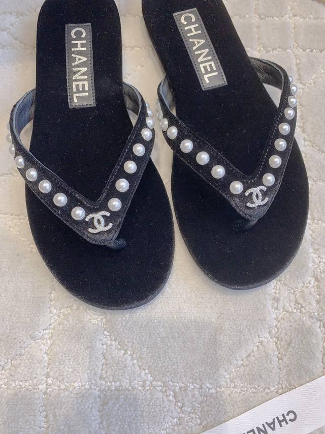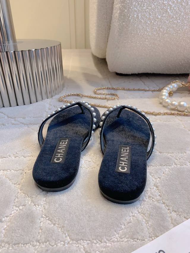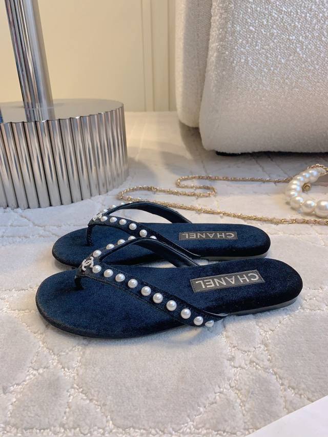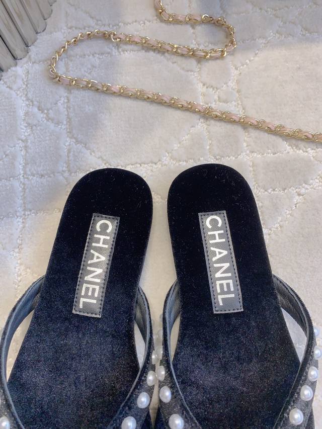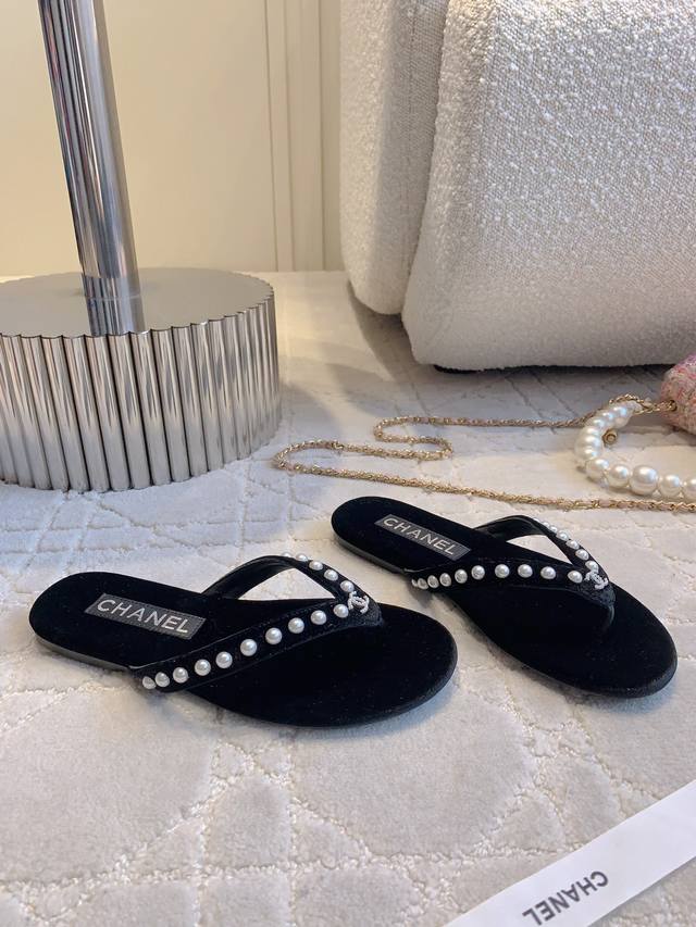 Chane*新款珍珠平底人字拖 简约又高级 美到我的心巴上了 简直是时髦巅峰 小而精致的珍珠logo真的很戳中我 省事又百搭