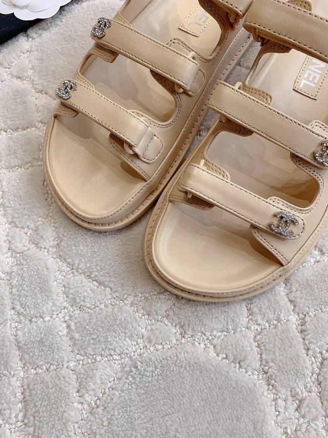 / 出厂价p Chane*新款升级版魔术贴拖鞋顶级品质!三带魔术贴设计 搭配小Logo钻扣 精致感满满 国内外明星网红的超爱! 鞋面羊皮 Zp开模五金扣 内里垫脚羊