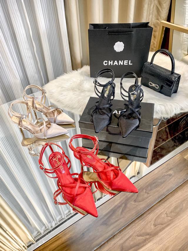 Chanel 香奈儿新款 真丝细带尖头高跟凉鞋 细跟单鞋女鞋