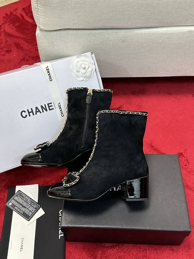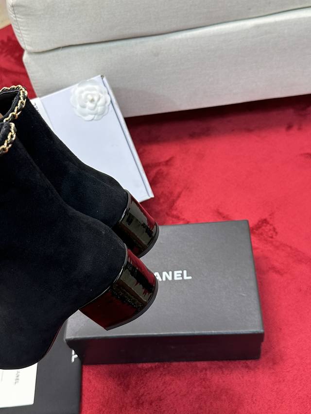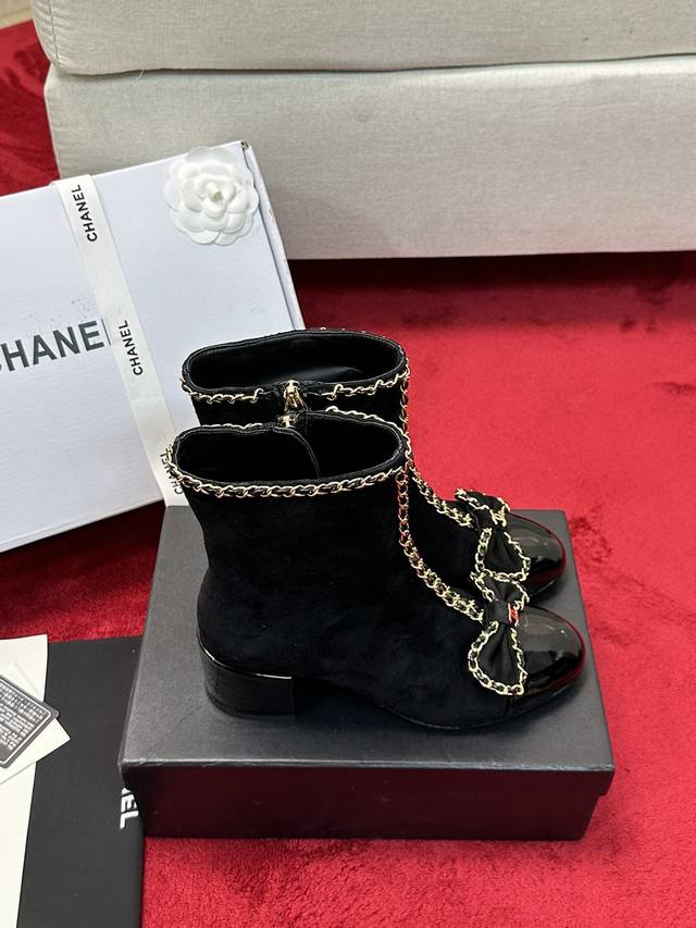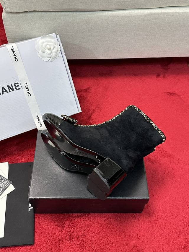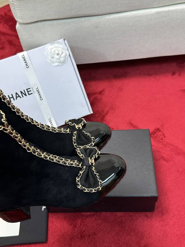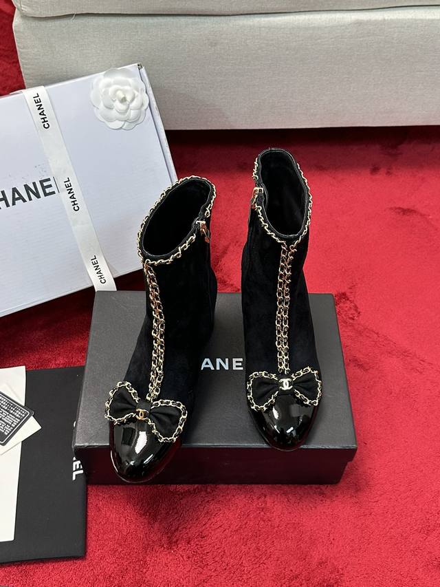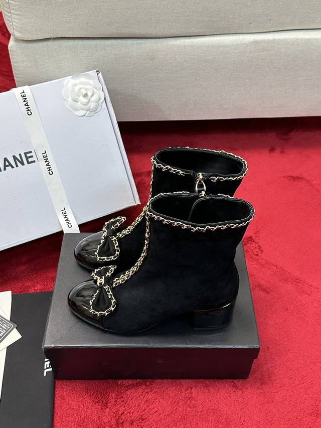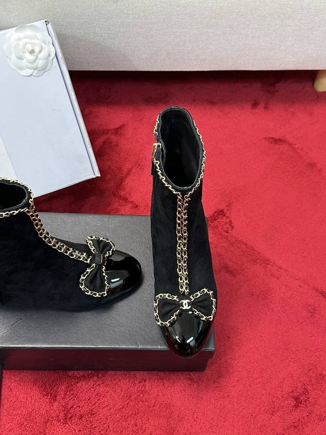 厂价 Chane*|小香24P链条蝴蝶结粗跟短靴 本季王炸神款香家经典蝴蝶结链条元素,时髦感十足的单品!造型立体饱满,帅气十足!谁穿谁爱上!真的值得入手! 面料