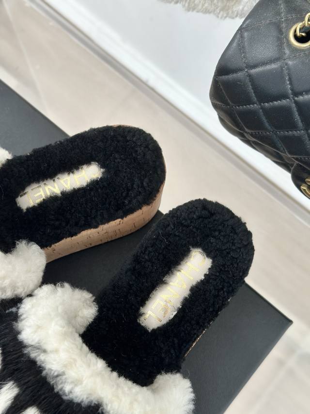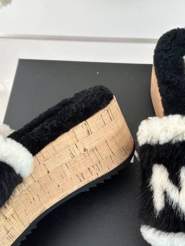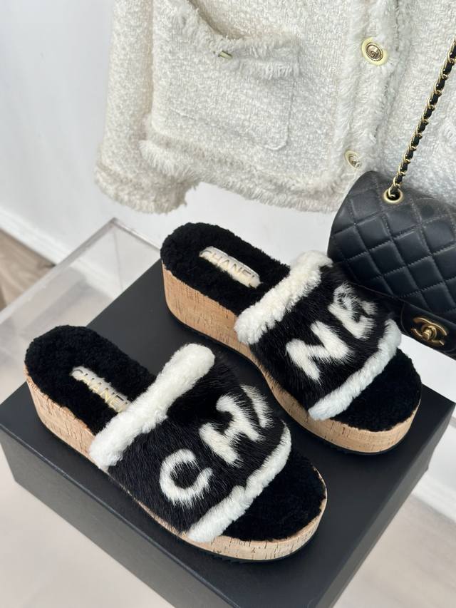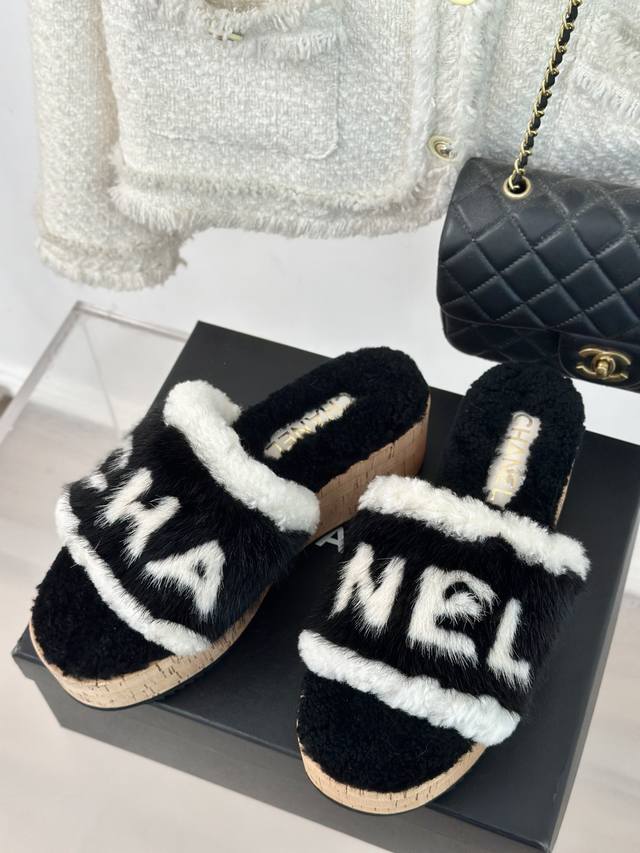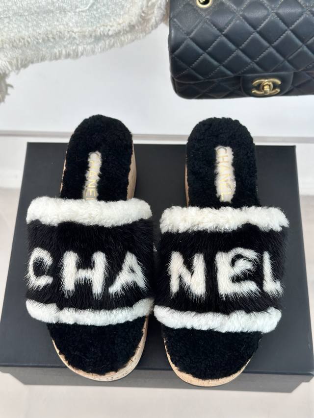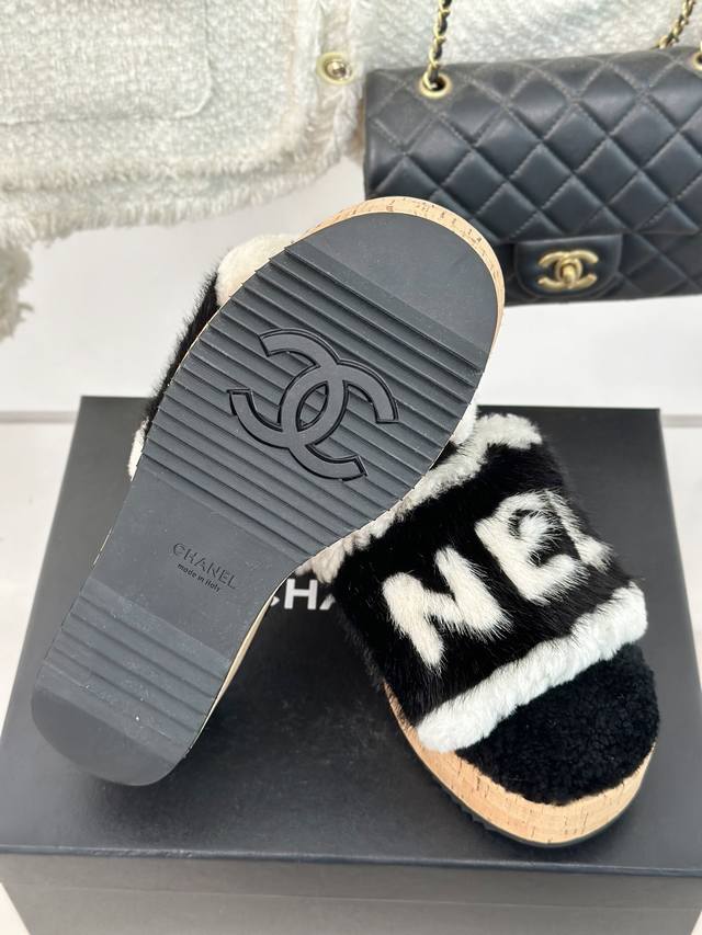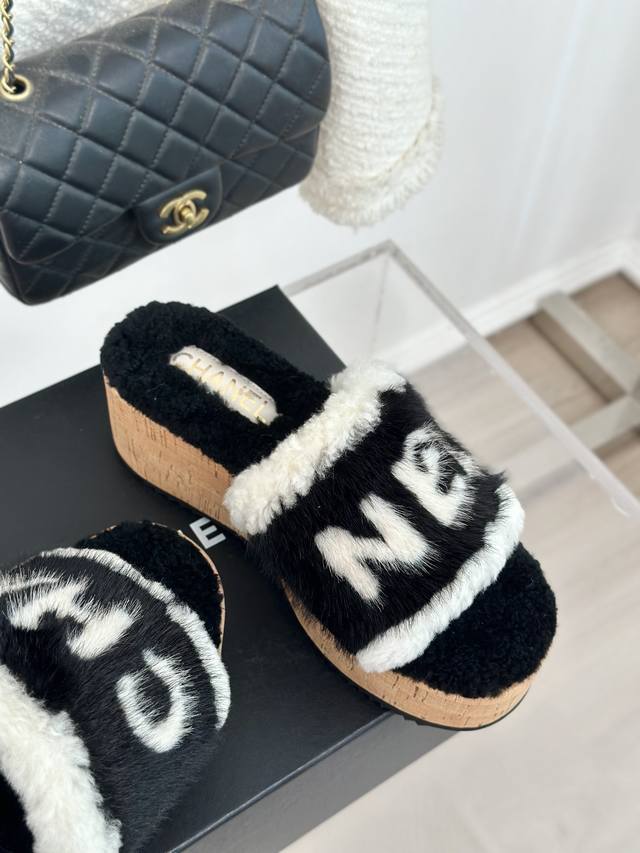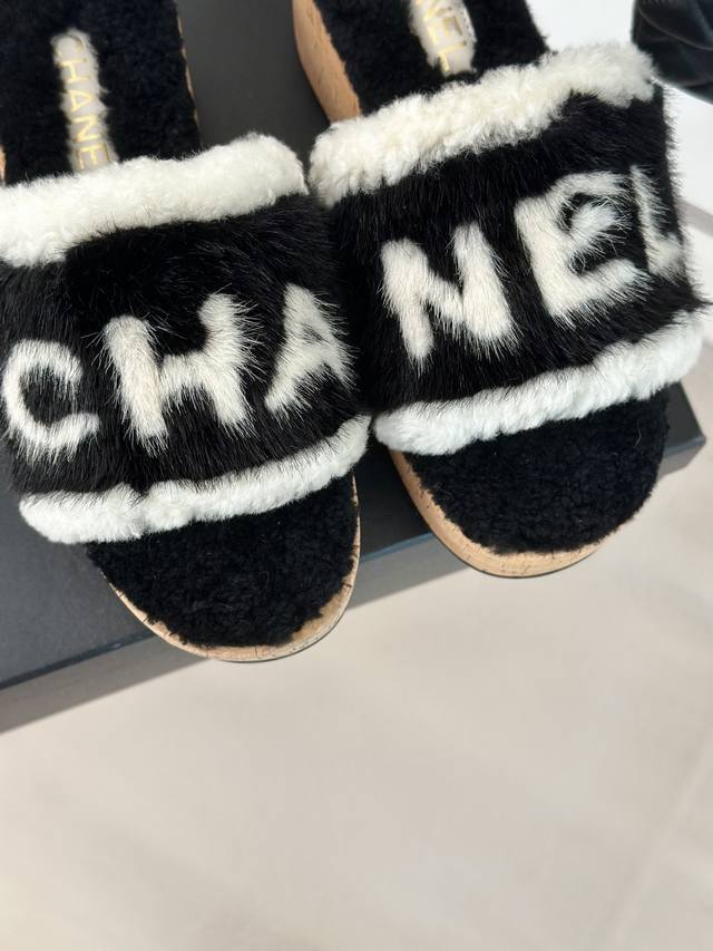 Chane* |小香经典字母木纹厚底毛毛拖鞋