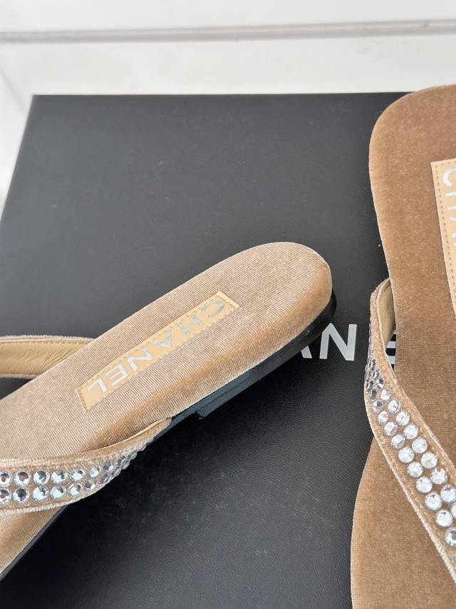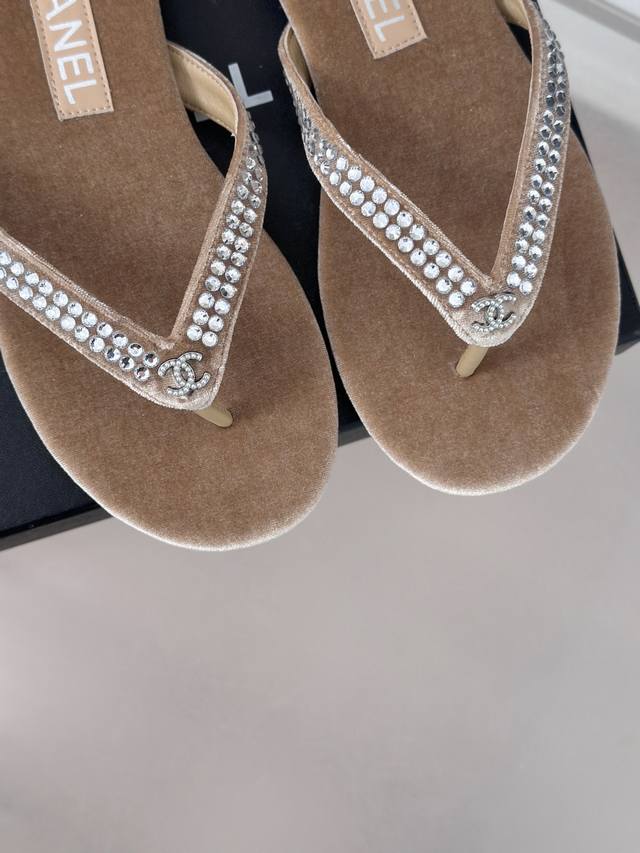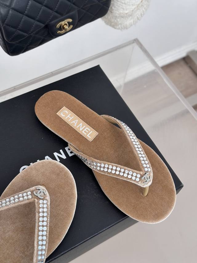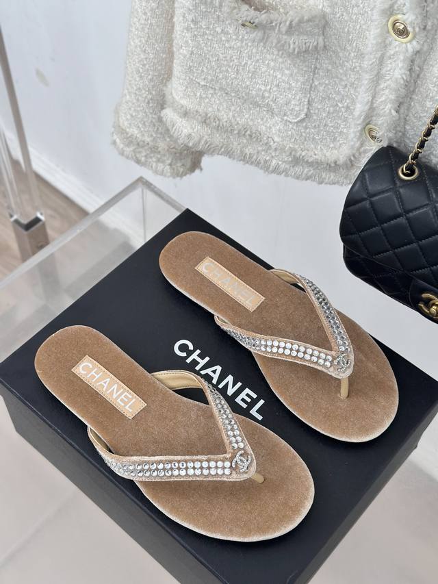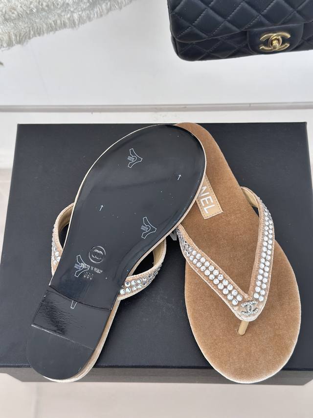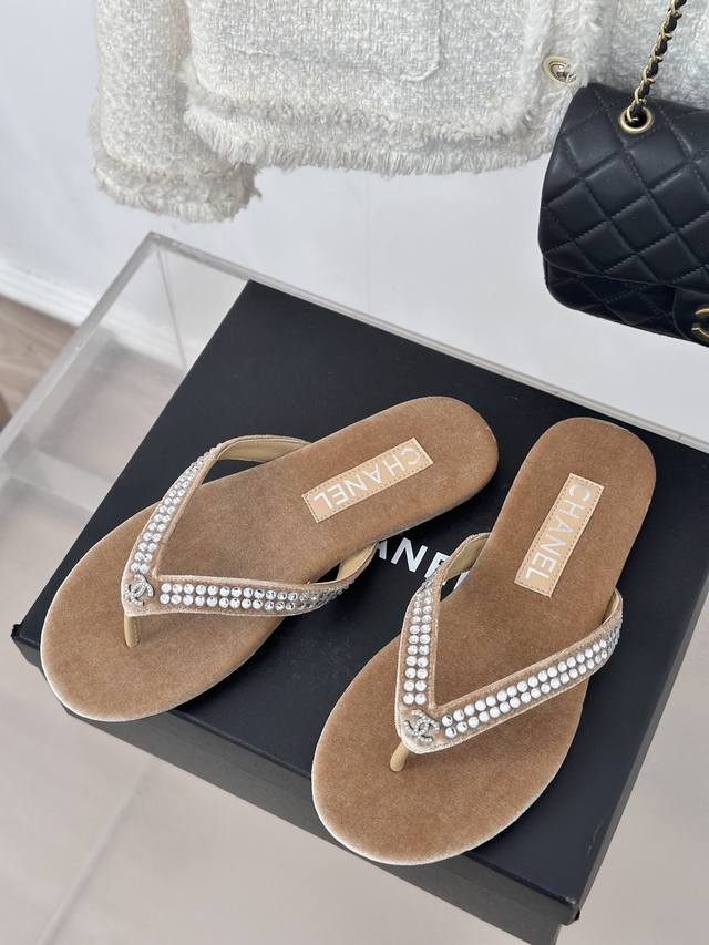 厂价 Chanel Thongs是25C春夏 秀场夹脚人字拖 夏天的人字拖莫名让人感到自由 带上镶嵌了双c水晶珍珠标志 太精致了 也太好看了吧 上脚超秀气显白!