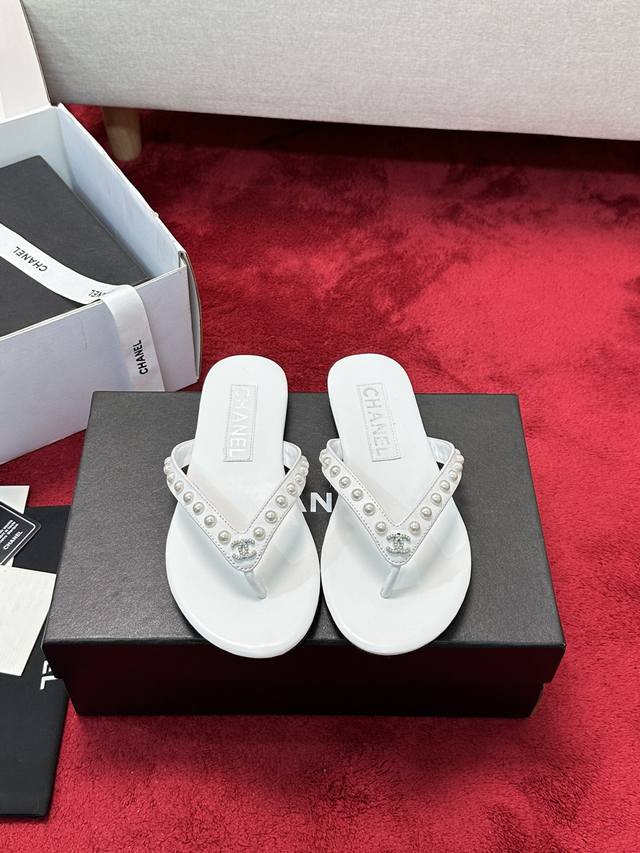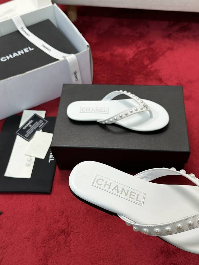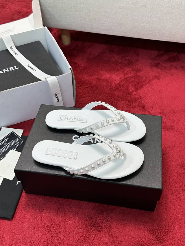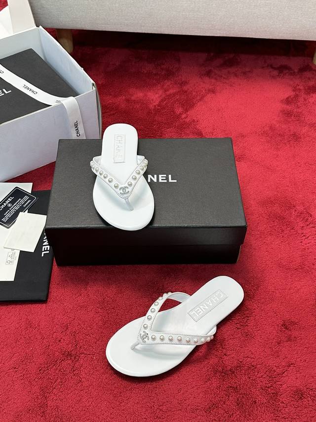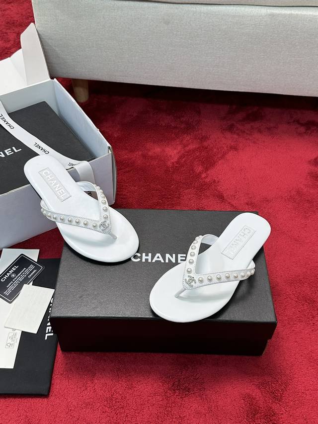 厂价 Chanel Thongs是25C春夏 秀场夹脚人字拖 夏天的人字拖莫名让人感到自由 带上镶嵌了双c水晶珍珠标志 太精致了 也太好看了吧 上脚超秀气显白!