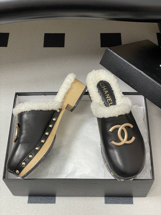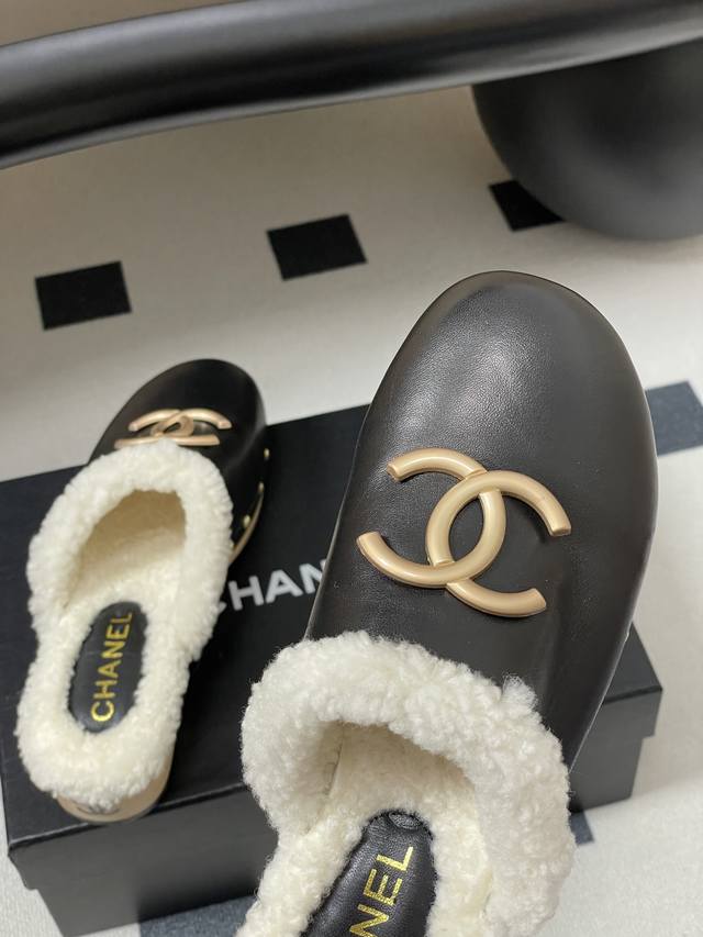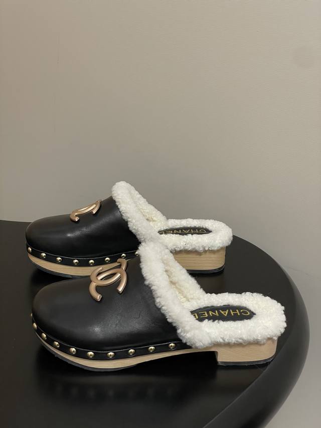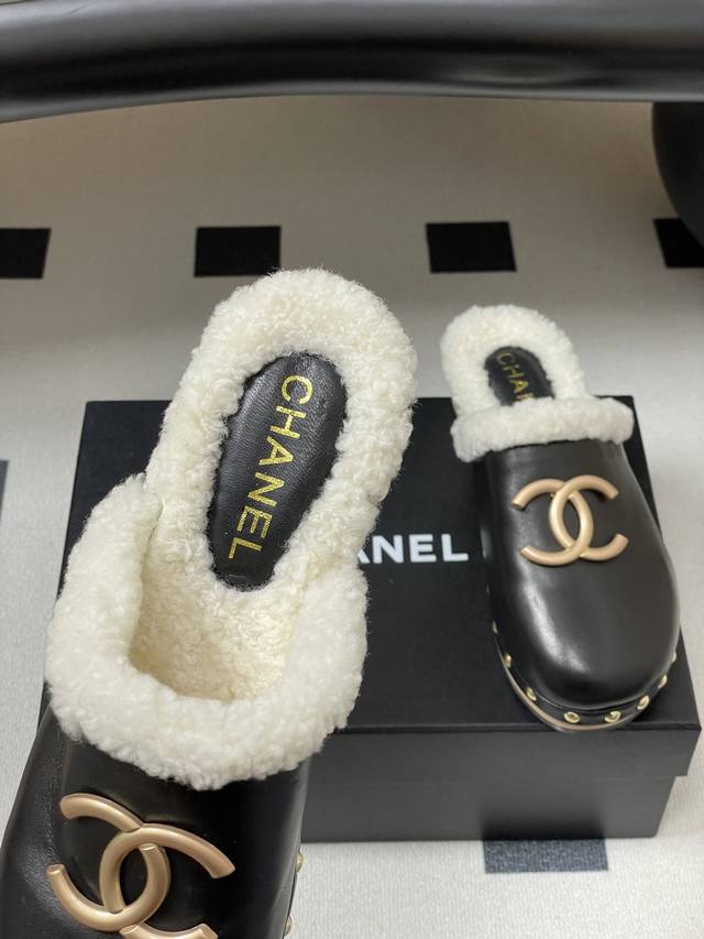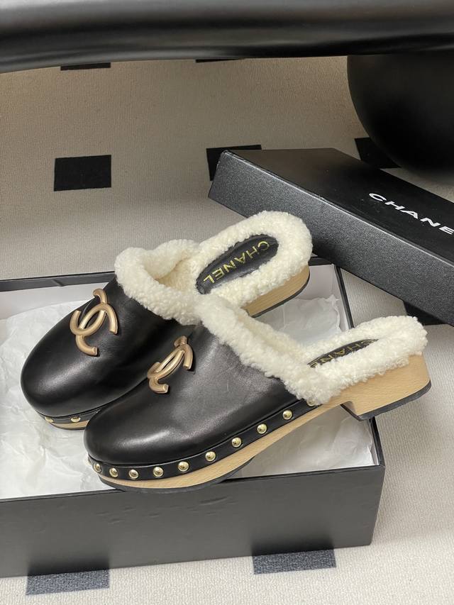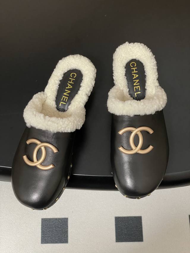 秋冬新款Chanel 25A小香经典双C扣羊毛拖鞋包头厚底实木底穆勒毛拖鞋