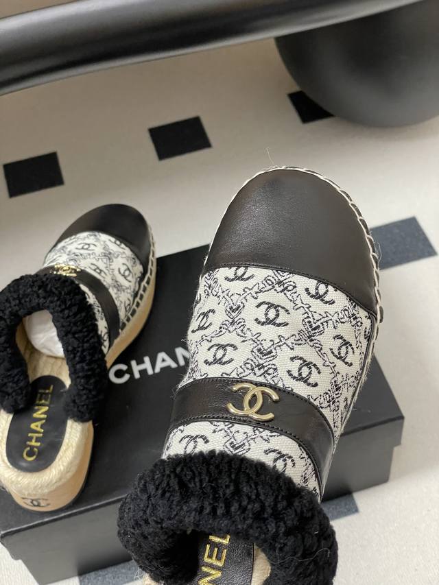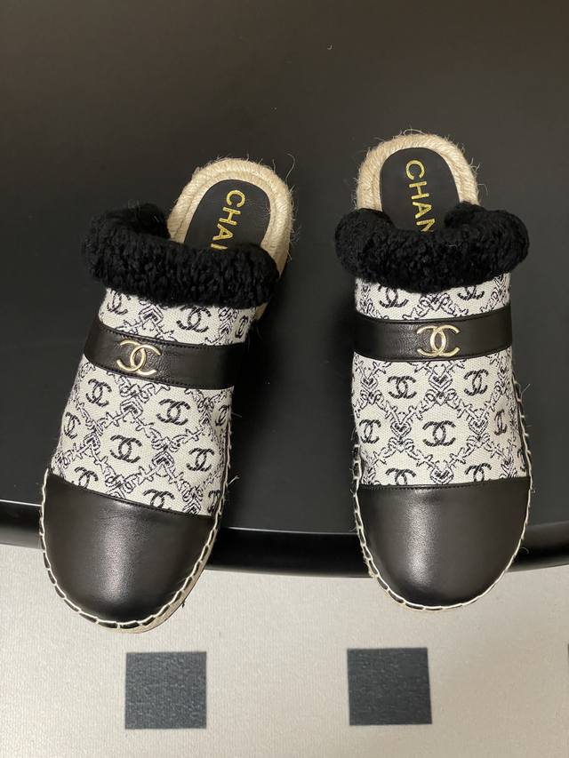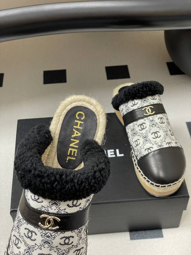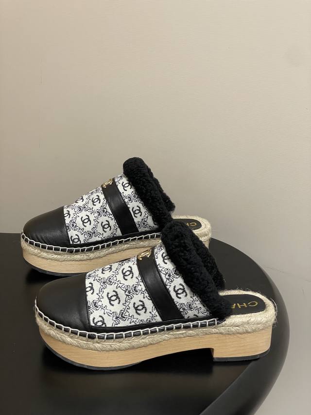 秋冬新款Chanel 25A小香经典链条双C扣羊毛拖鞋包头厚底实木底穆勒毛拖鞋