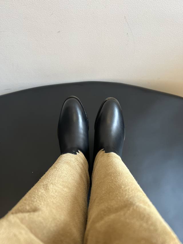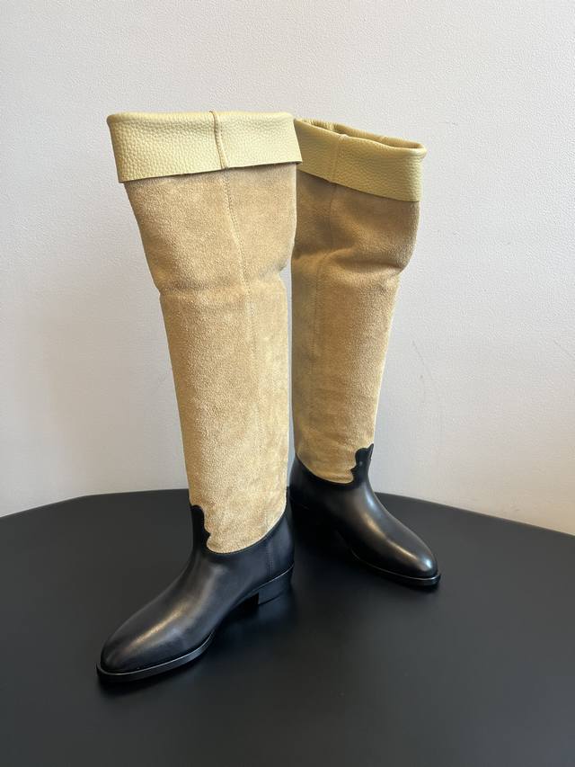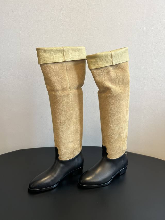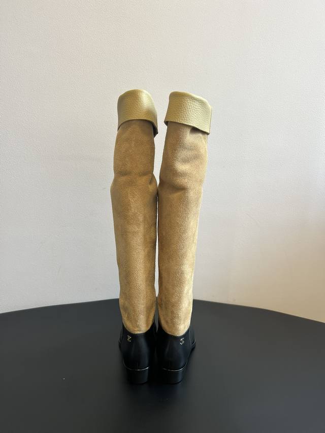 Chane* 香奈儿25秋冬小香麂皮拼色一脚蹬骑士中靴高靴!复古风靴子西部牛仔靴!