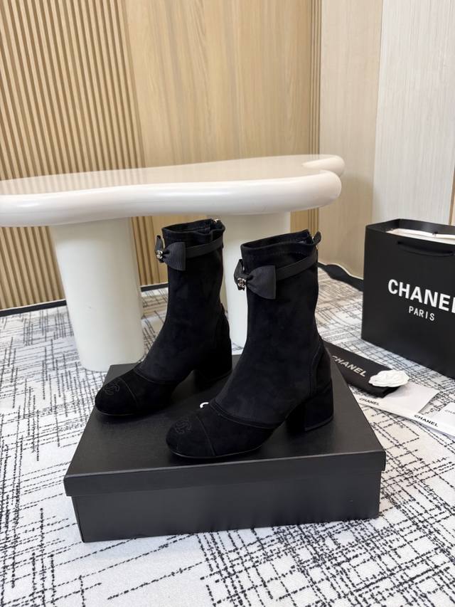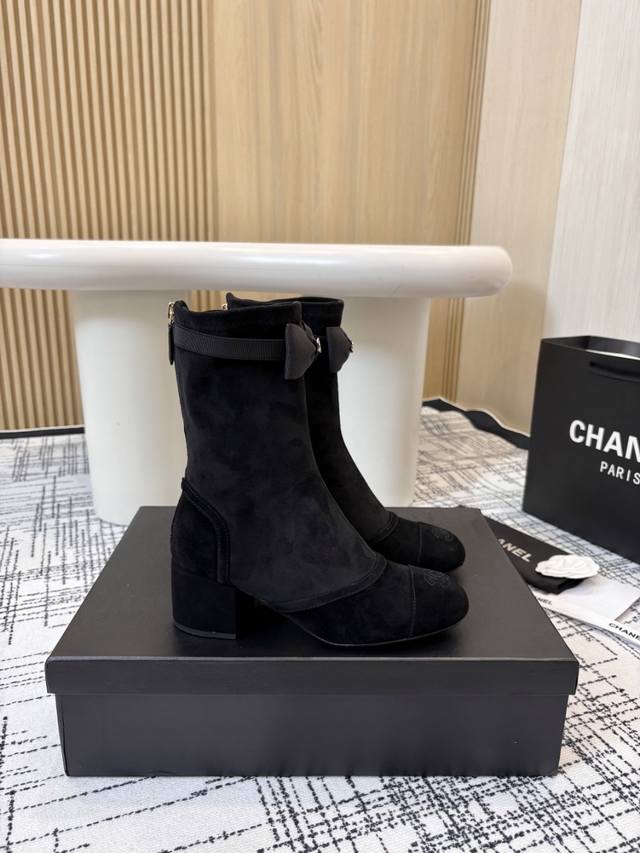 chanel香奈儿小香经典粗跟后拉链短靴 这双靴子巧妙融合品牌标志性元素 以大胆而和谐的拼色设计 打破常规 鞋跟处精致的双C 低调奢华 彰显品牌底蕴 。 无论是