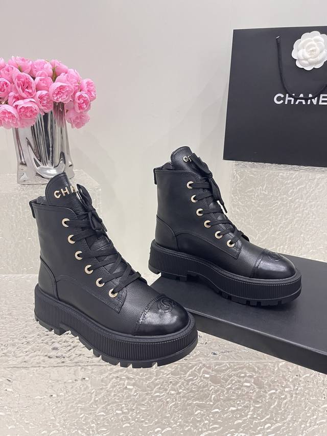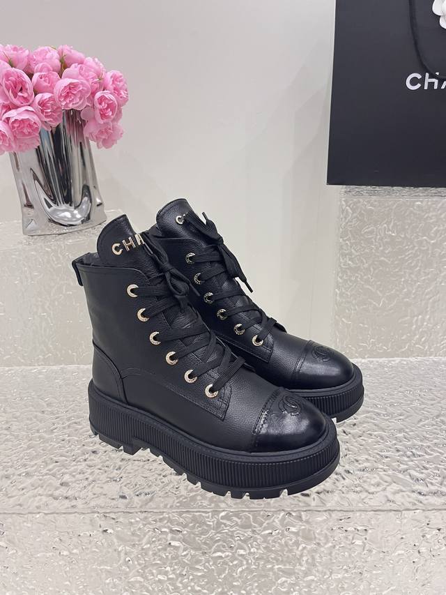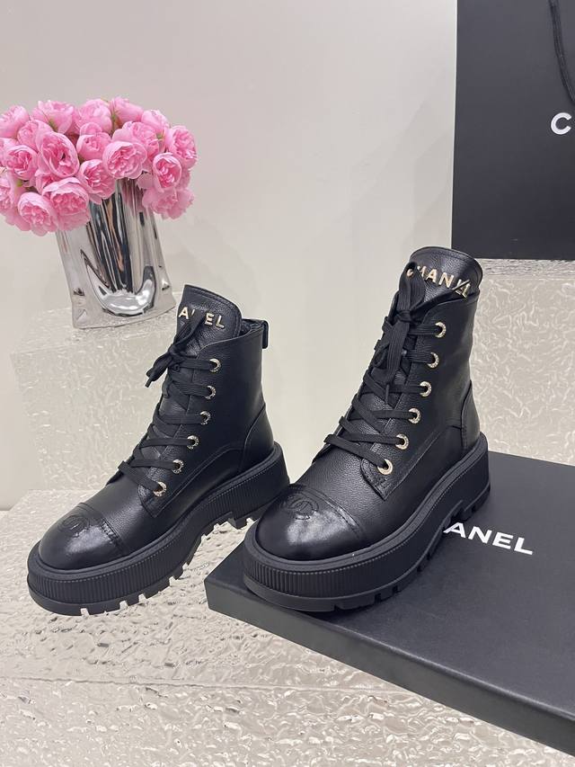 Chanel香奈儿小香 秋冬羊皮系带短靴新品 版型也香家马丁靴基础版型,利落帅气 鞋面用了牛皮,超级柔软的贴肤感,挺阔饱满,帅气拿捏! 内里柔软水染小羊皮! 鞋