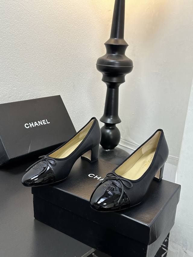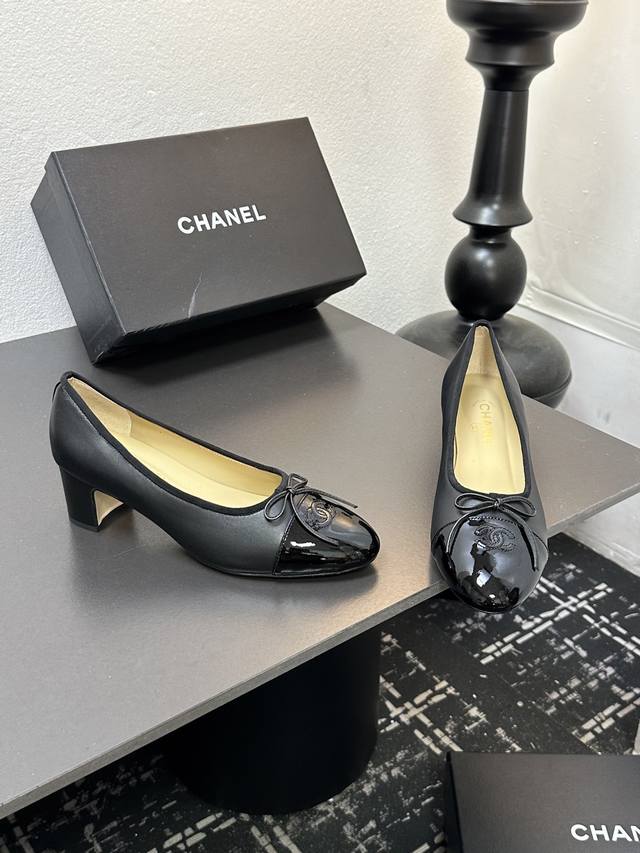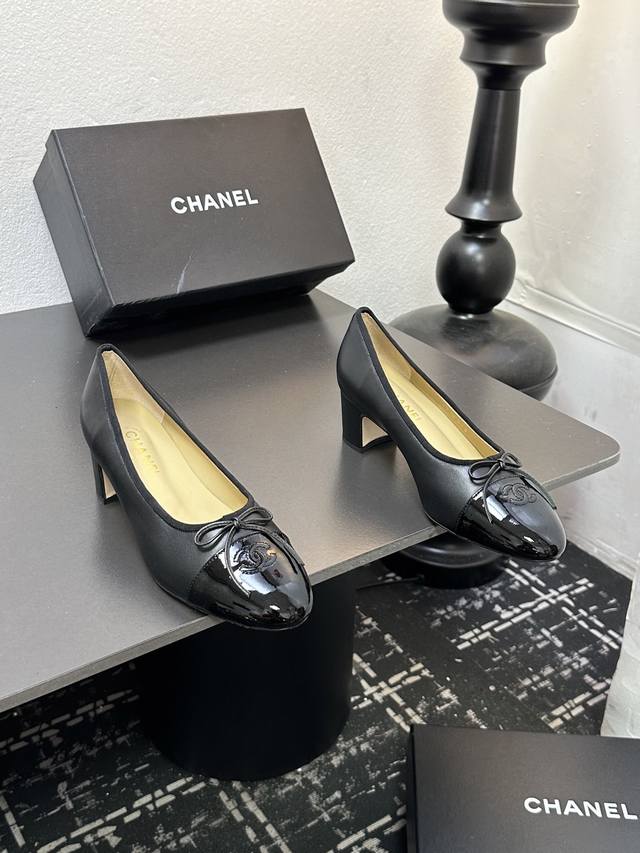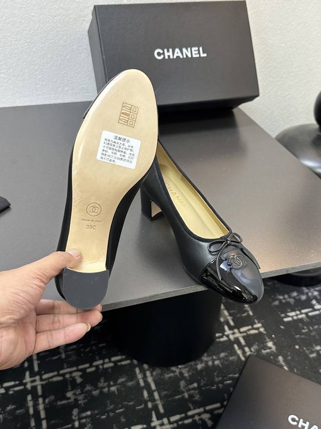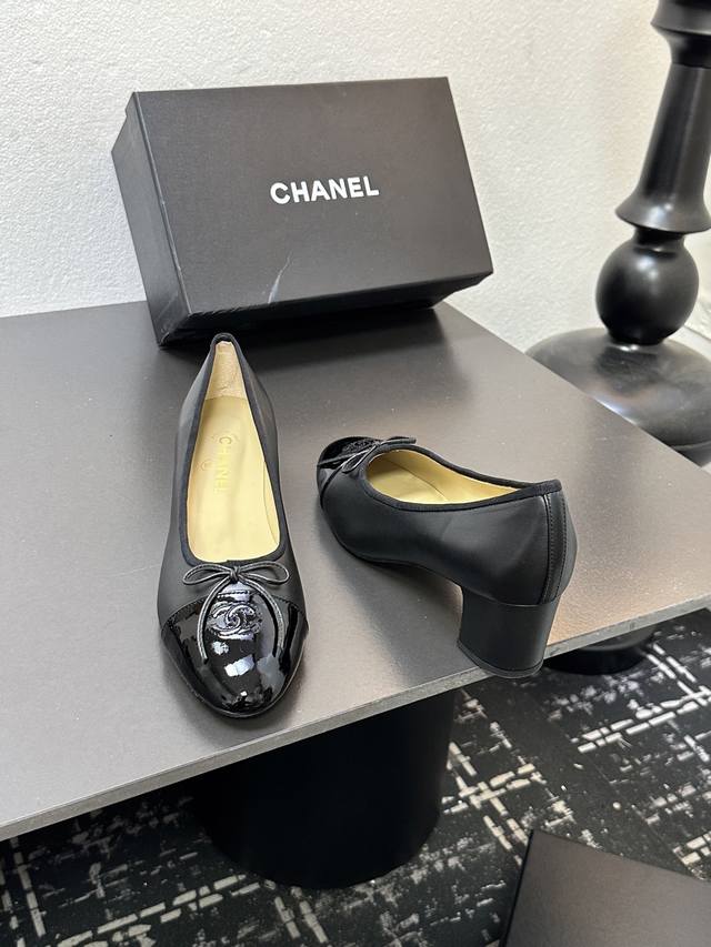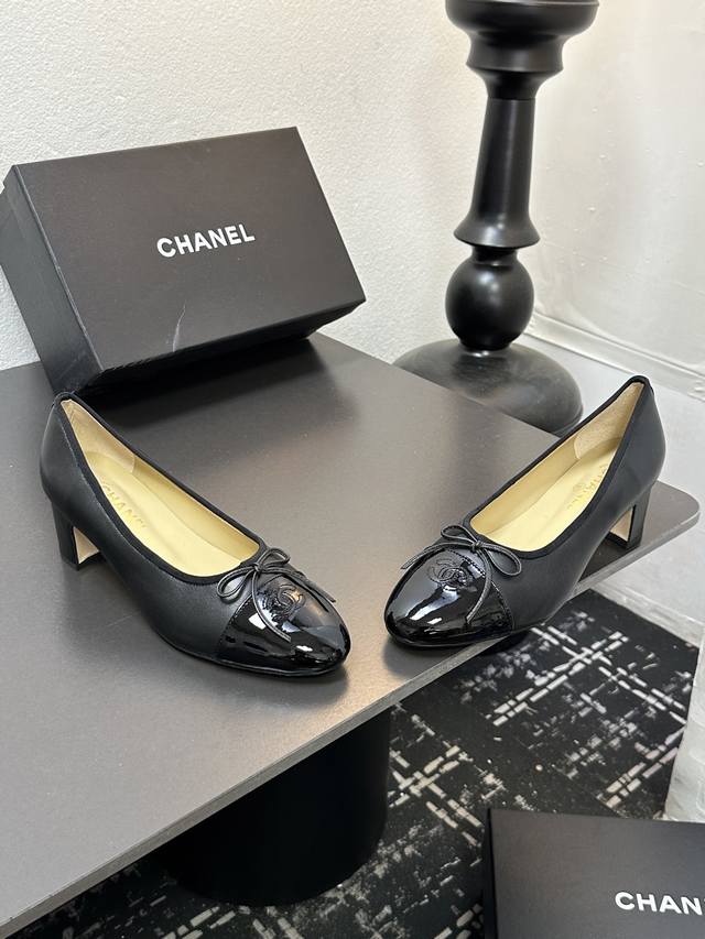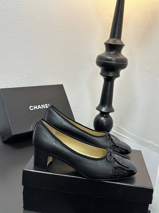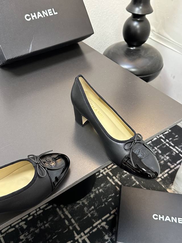 Chanel 香奈儿Coco小香羊皮蝴蝶结中跟芭蕾舞鞋拼接高跟单鞋 经典重塑,梦幻升级鞋内外均选用上乘羊皮,温驯贴合。羊皮细带以轻盈姿态攀附脚背,将经典玛丽珍鞋化为可佩戴艺术。