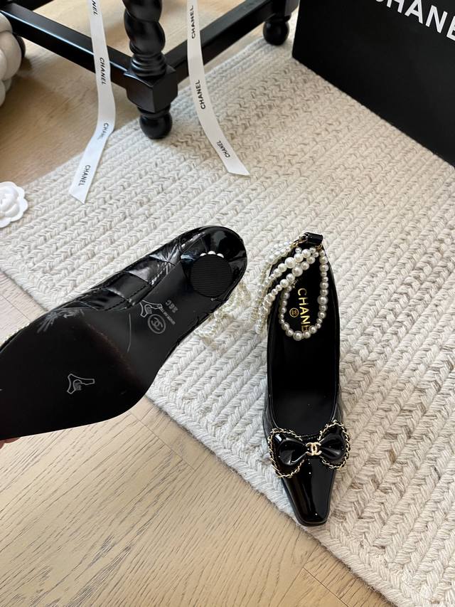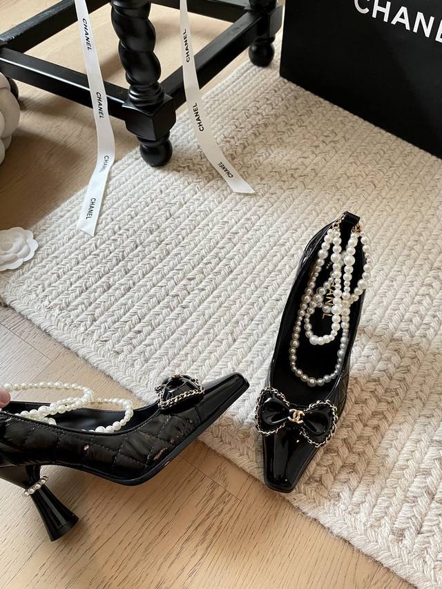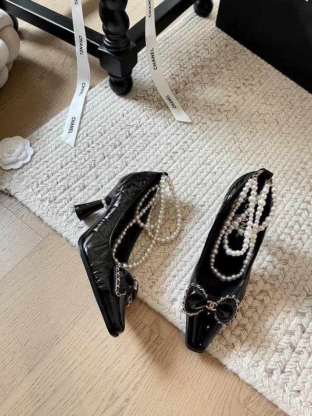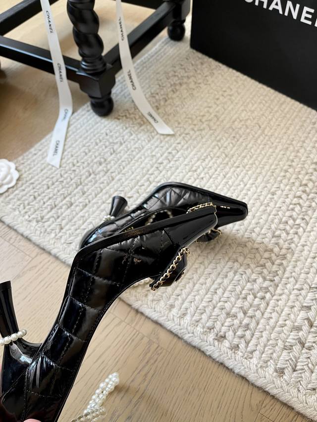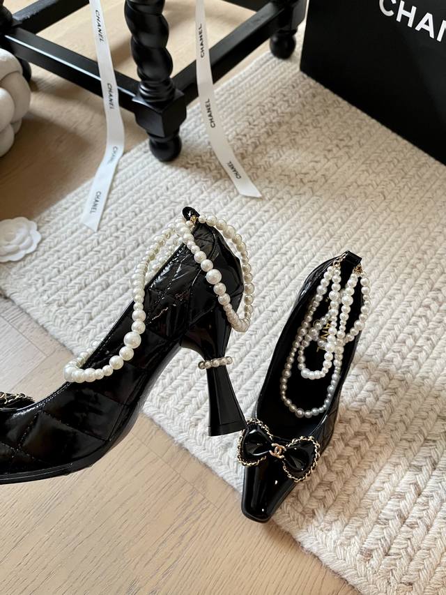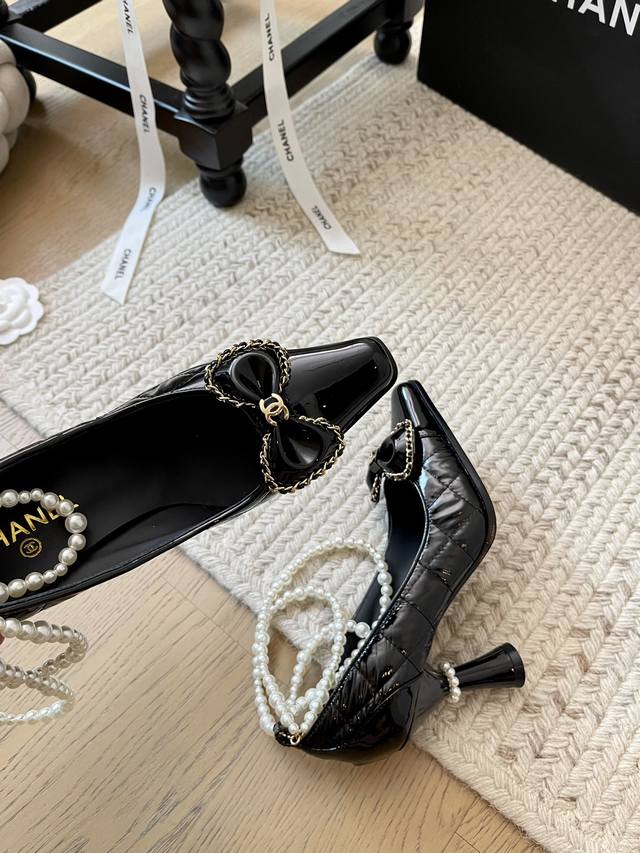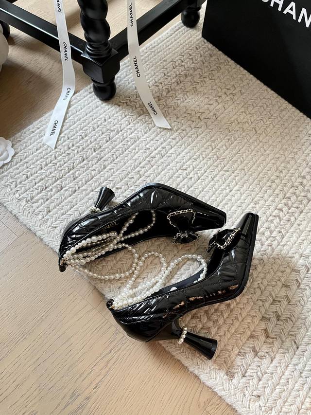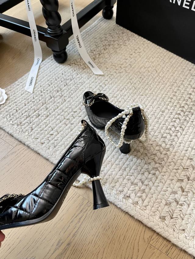 Chanel 24B秋冬新款珍珠菱格链条高跟! 顶级版本!珍珠链条搭配经典百搭 抢先发售 鞋面小牛漆皮羽绒布 内里垫脚羊皮 原版真皮大底 跟高:8Cm 码数:3
