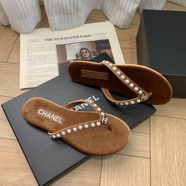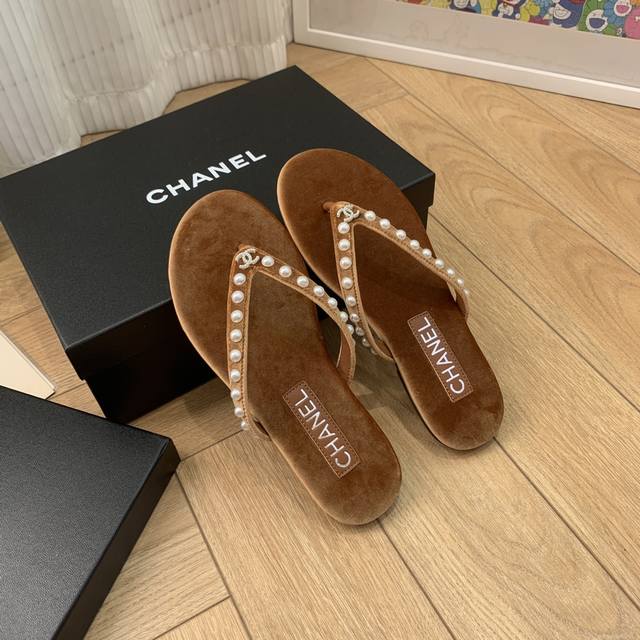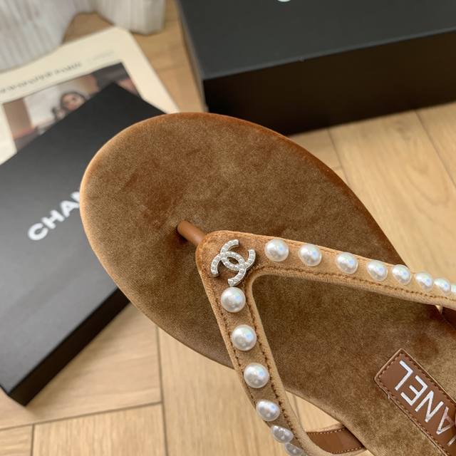 Chanel Thongs是25C春夏 秀场夹脚人字拖 夏天的人字拖莫名让人感到自由 带上镶嵌了双c水晶珍珠标志 太精致了 也太好看了吧 上脚超秀气显白! 鞋面