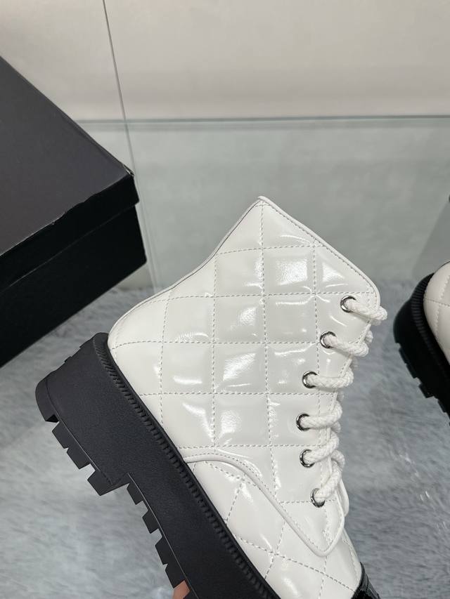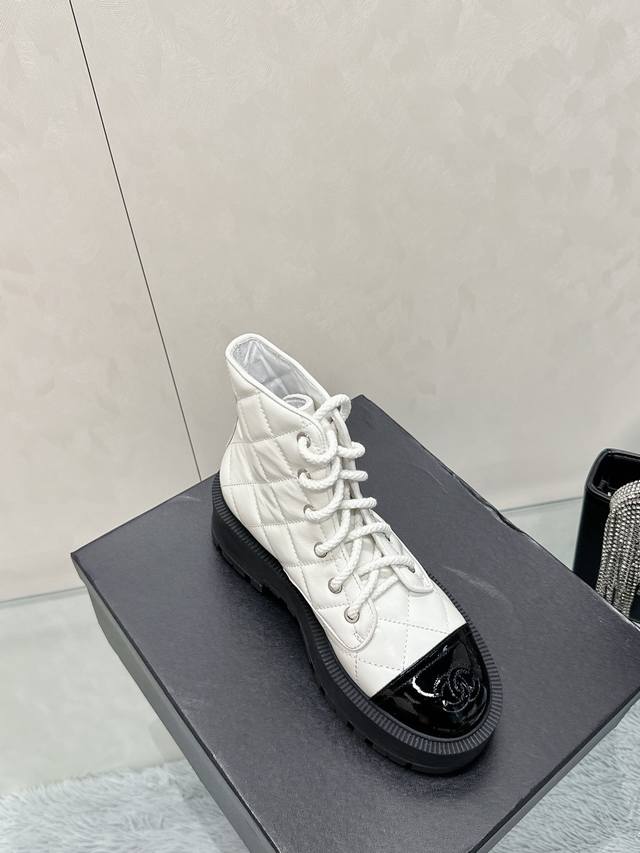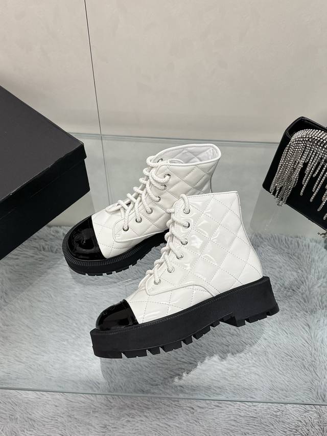 / 工厂价: 香奈儿2024秋冬新款 高版本 小香风靴筒电绣菱格拼色厚底马丁靴女增高圆头系带短靴真皮女靴 面料:原版1:1意大利牛皮 内里:羊皮 大底:成型大底,底