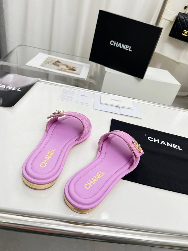 橡胶底 +40可订做真皮底 Chanel23P香奈儿春夏新款蜜儿拖鞋,夏季必备款,女神系列,拥有香家特色优雅名媛气质,超级耐看,让人无法抗拒。 鞋面彩用原版开模