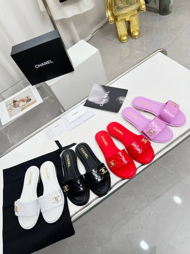 橡胶底 +40可订做真皮底 Chanel23P香奈儿春夏新款蜜儿拖鞋,夏季必备款,女神系列,拥有香家特色优雅名媛气质,超级耐看,让人无法抗拒。 鞋面彩用原版开模五金扣电绣 ,羊皮里柔软舒适 , 码数:35-41 颜色:白色、红色、黑色,紫粉