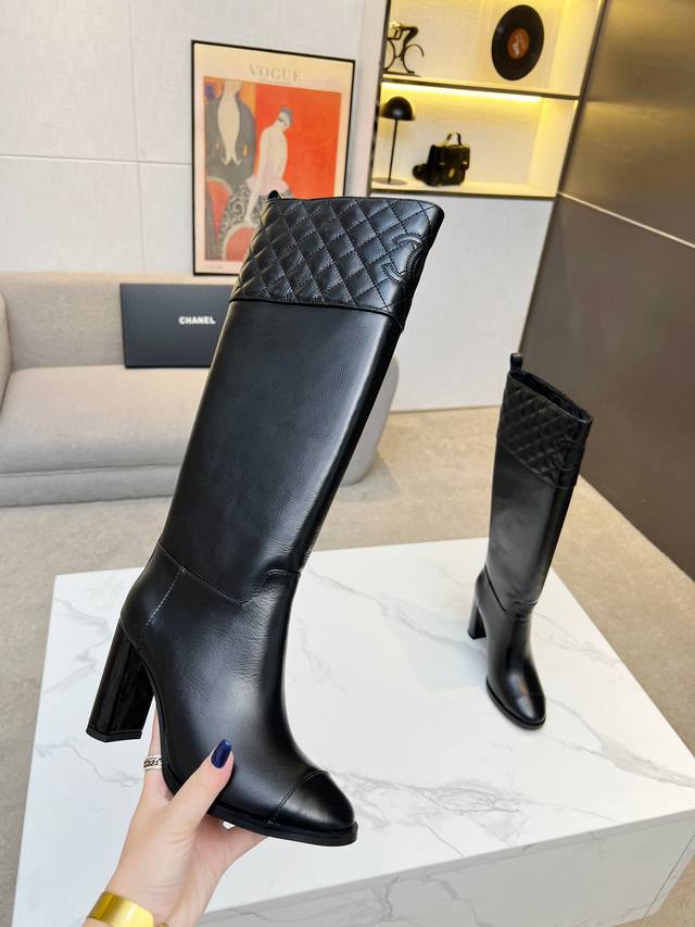 / 香奈尔秋冬季必备 菱格机车长靴 ,小香家超级经典的一款,甜酷造型 上脚轻松增高又拉长腿型 搭配电绣洋气又时髦 原版一比一复刻 面料:头层牛皮 跟高:8 内里:羊