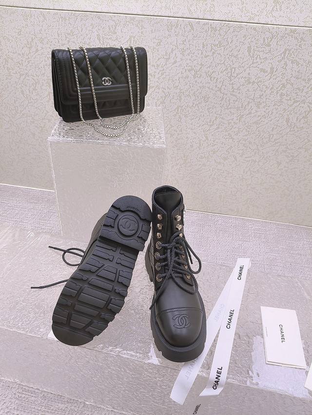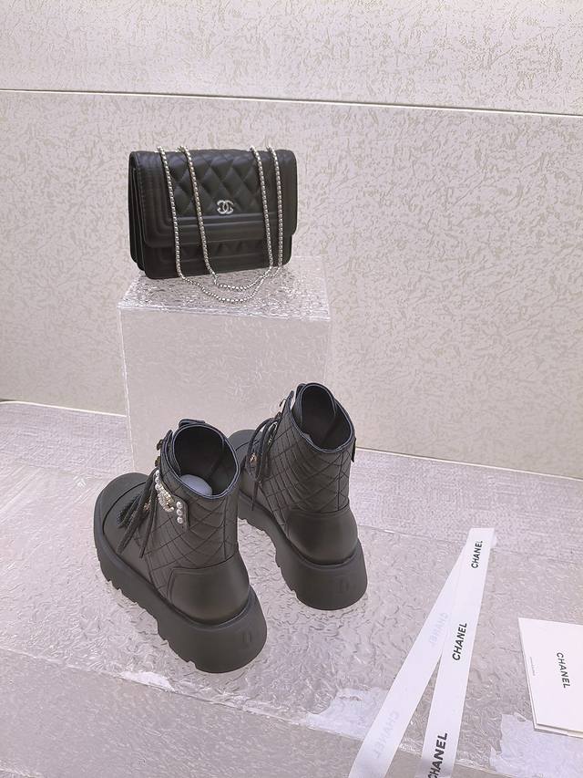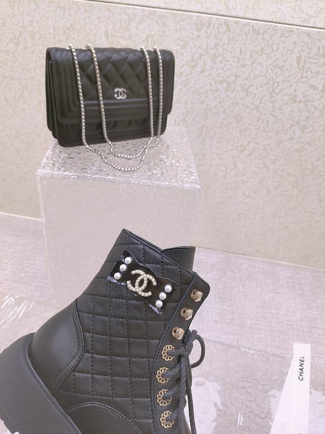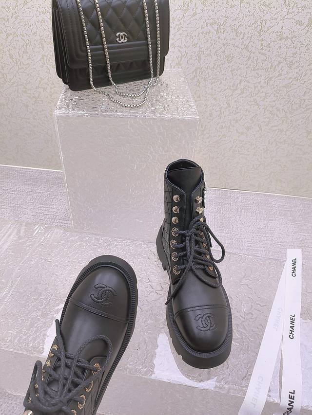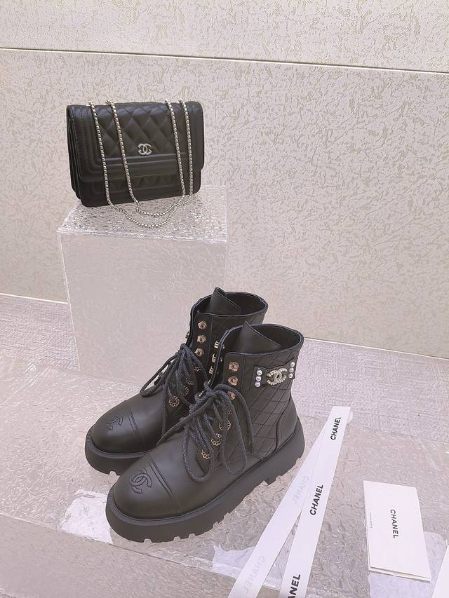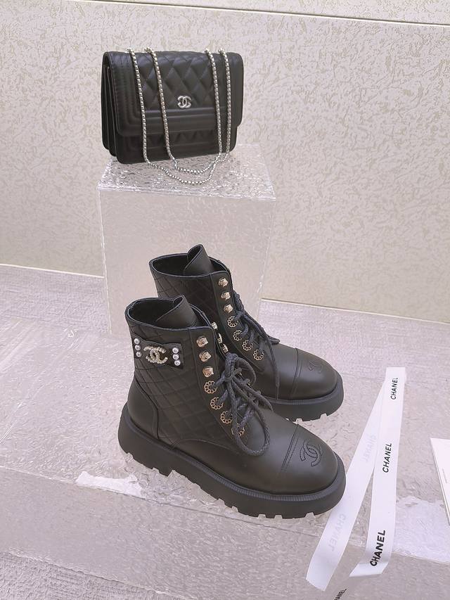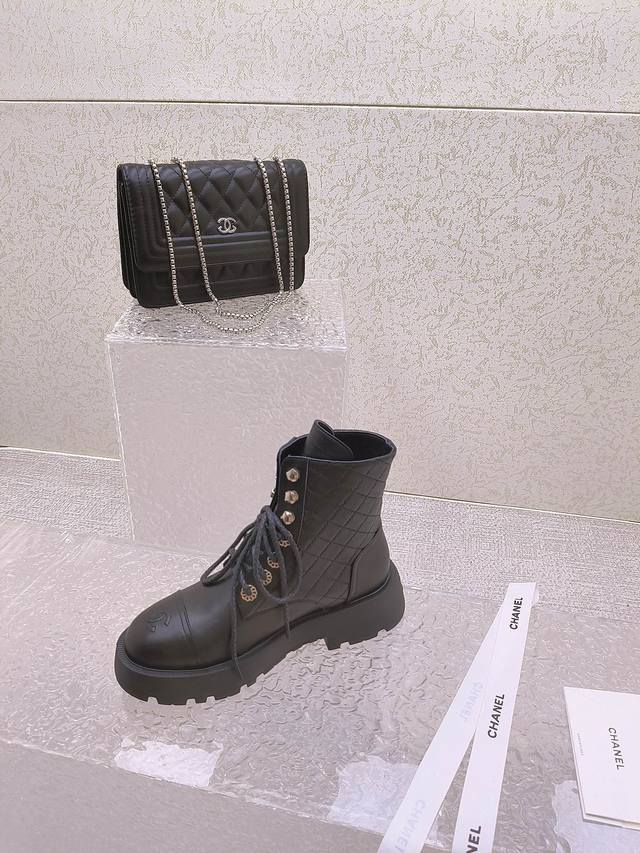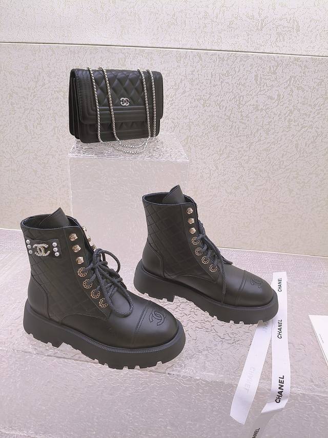 工厂价: 香奈儿2024秋冬新款 高版本 小香风靴筒电绣菱格拼色厚底马丁靴女增高圆头系带短靴真皮女靴...