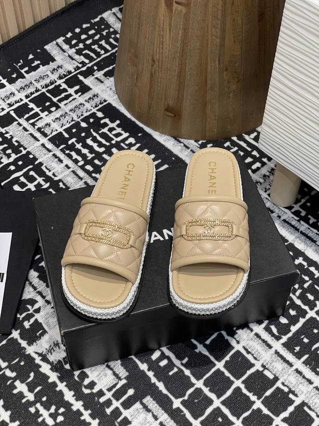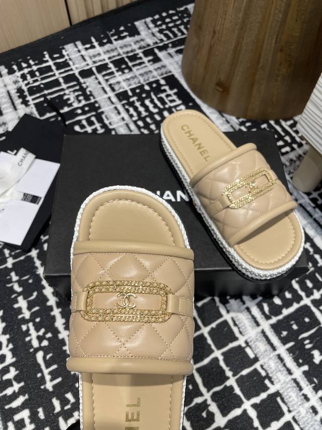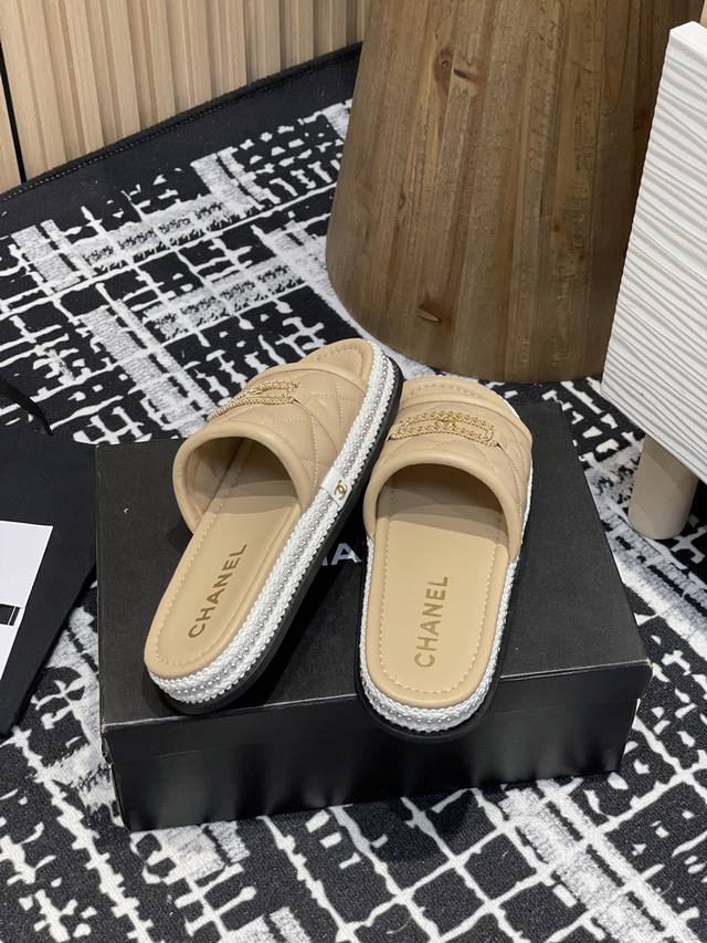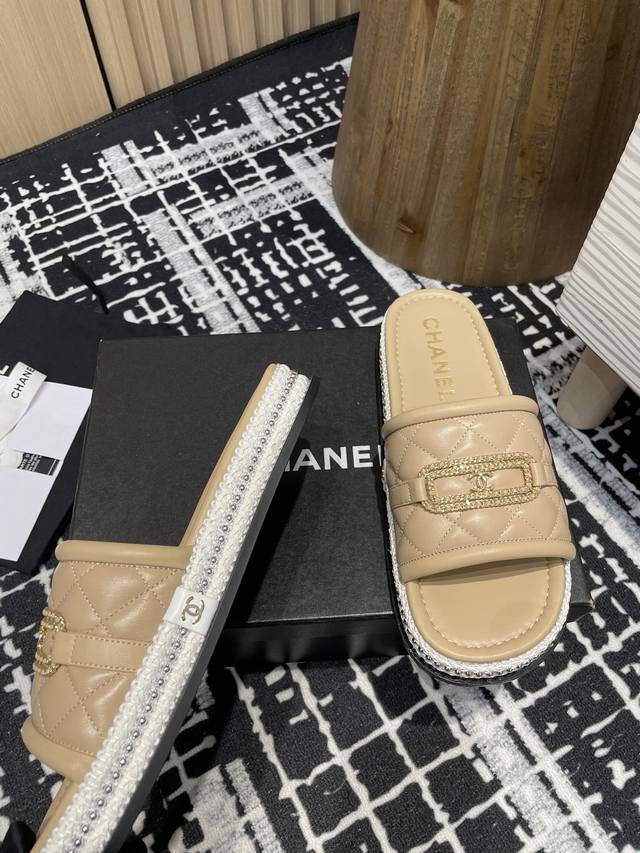 菱格链条双C懒人拖鞋草编珍珠圈边香奶奶家一贯的优雅名媛气质高级感十足!上脚非常nice~