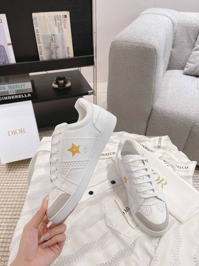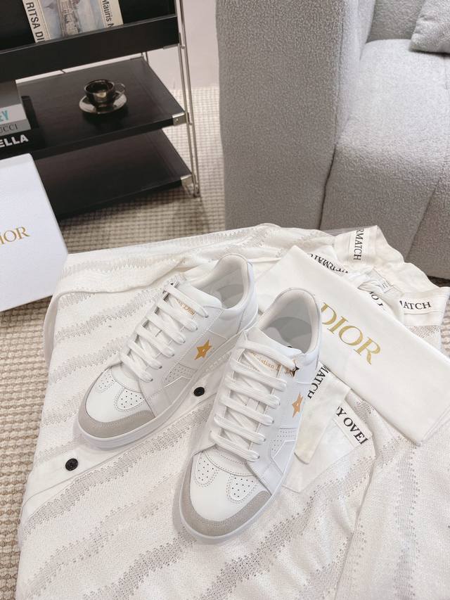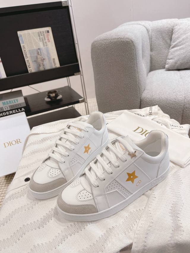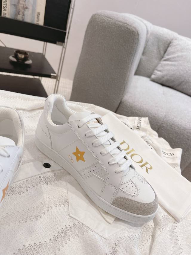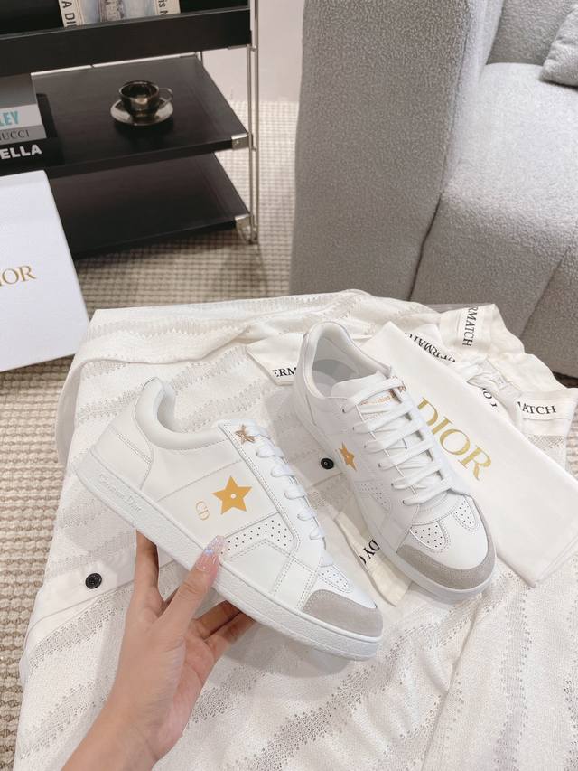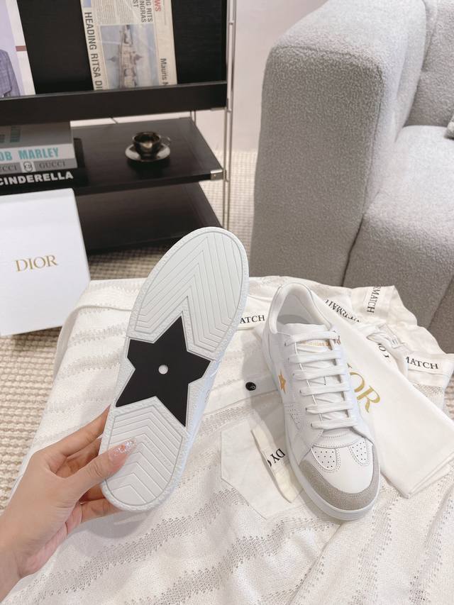 饰以同色调绒面革镶片金属星星装饰鞋带孔眼,提升格调。款式轻盈搭配“Christian Dio”标志薄鞋底,四季皆宜,可与各式休闲造型搭配,增添点睛之笔 经典超耐看 鞋面牛皮拼接 原版Tpu大底。