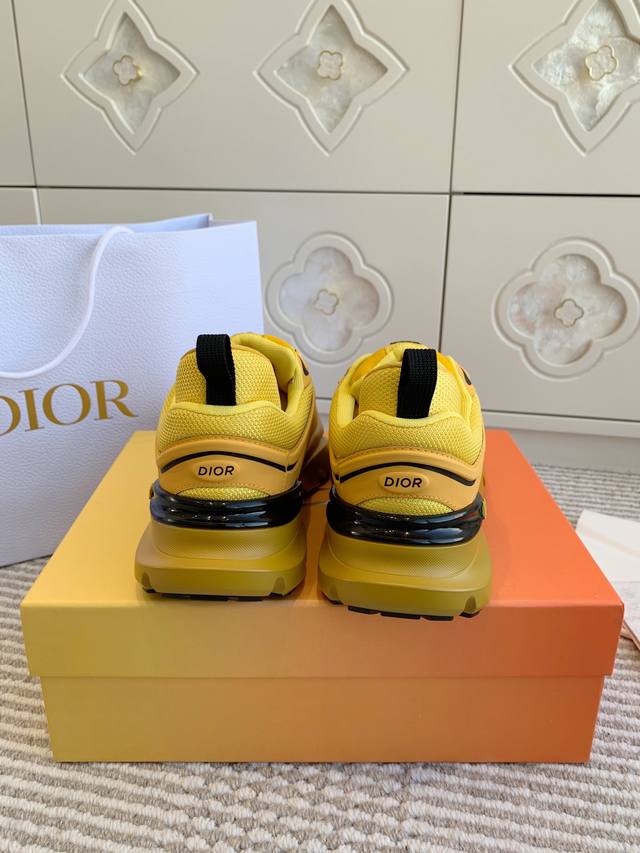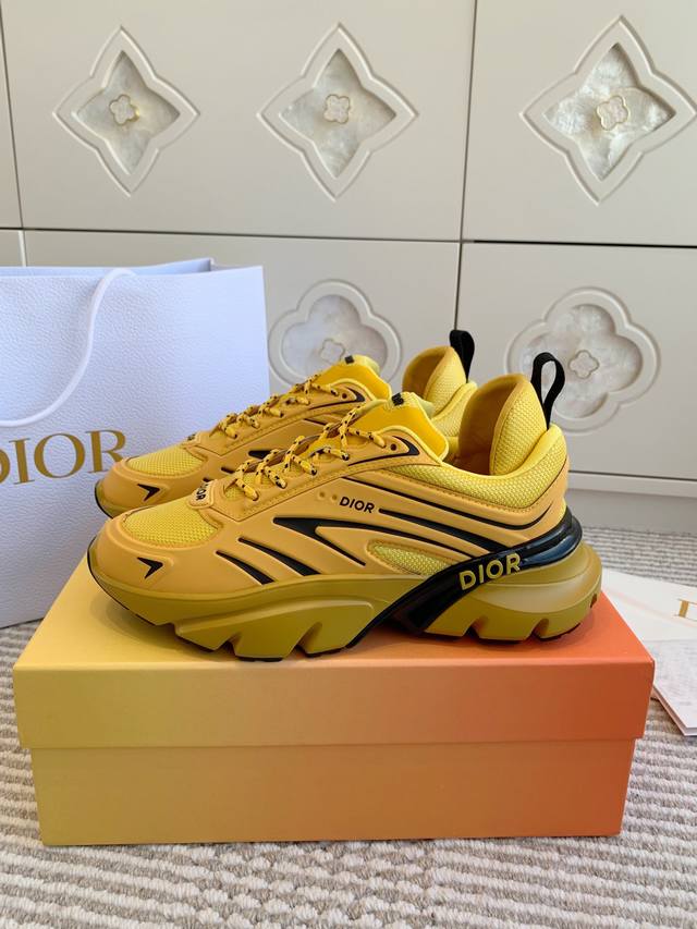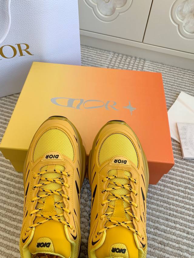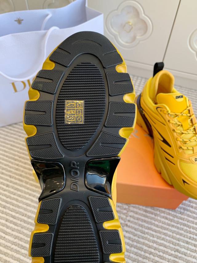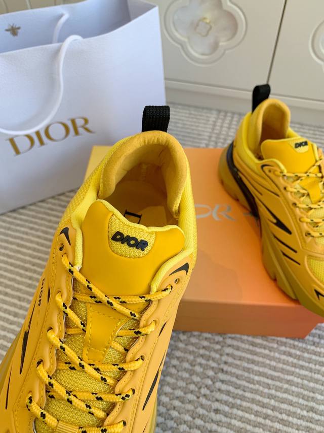 这款 B44 Blade 运动鞋采用充盈的廓形设计,醒目时尚,灵感源自 2000 年代 采用黄色网眼织物精心制作,搭配同色调科技面料拼接,鞋底饰以对比鲜明的 Blade 镶片,向跑步运动致敬 鞋面、鞋跟和侧面均点缀以 Dior 标志 搭配双色鞋带更显精致,后侧内部加垫支撑设计彰显运动审美风格,可为各式休闲造型增添现代风范