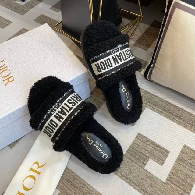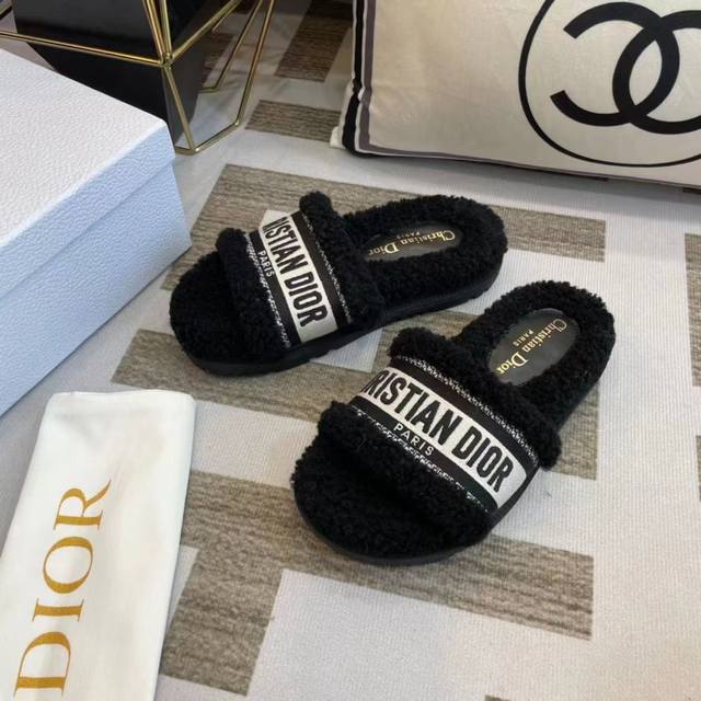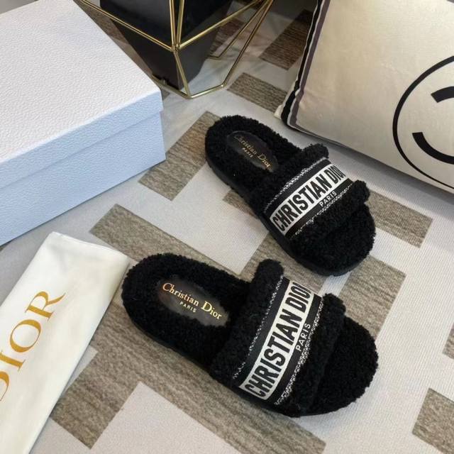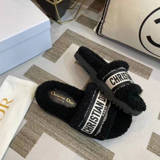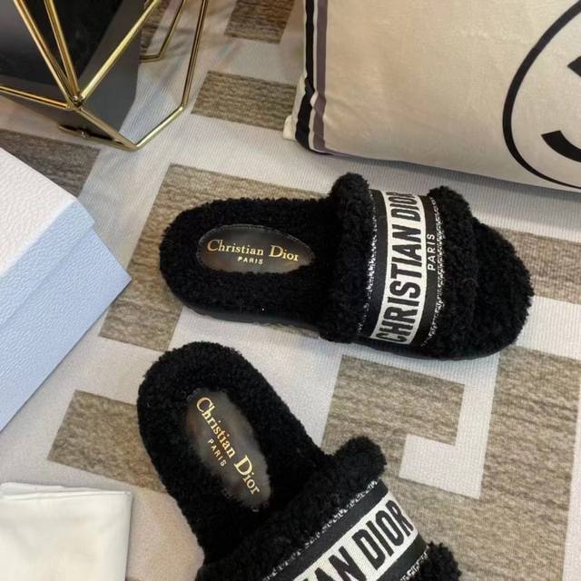 冲量价: Dior 迪奥毛拖鞋系列 23厚底毛拖鞋 时尚明星网红爆款 舒适百搭羊毛拖鞋, 平底防滑底 更胜一筹 梭织羊毛 原版电绣字母 原版底 35-40码 41 42定做