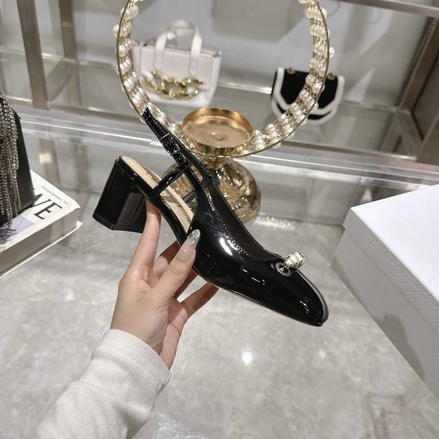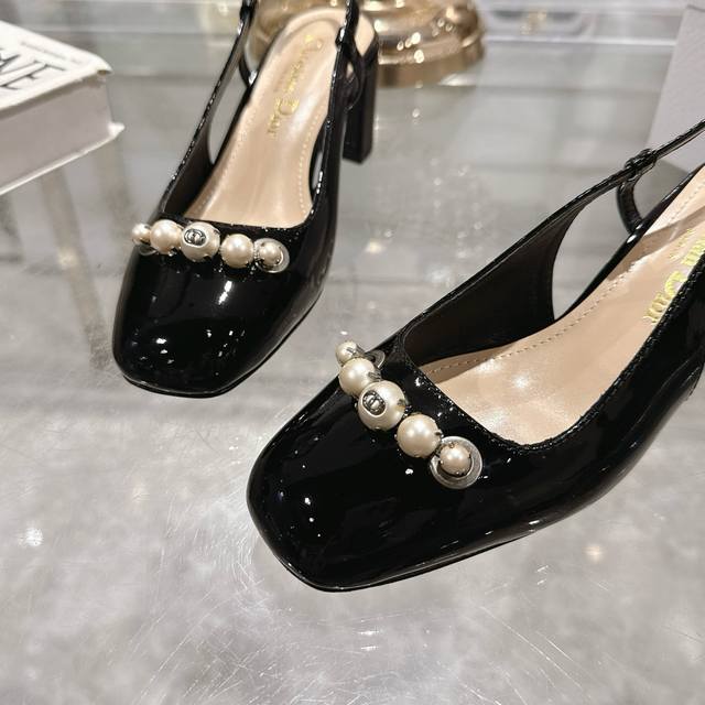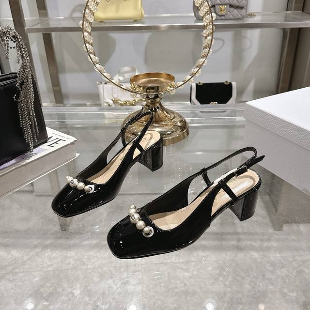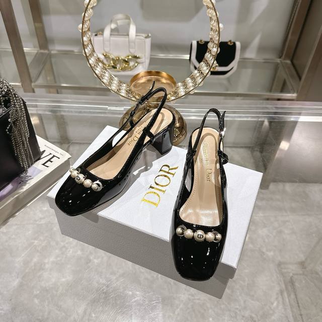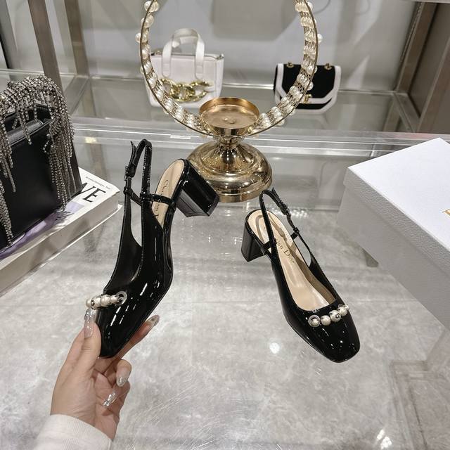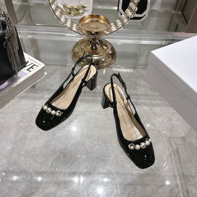 25Ss早春新款迪奥Dior Paris 露跟高跟鞋Cd珍珠扣粗跟后空凉鞋