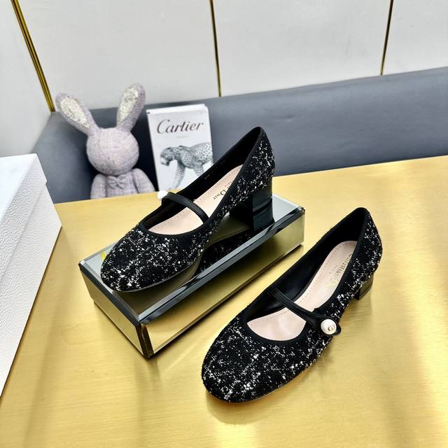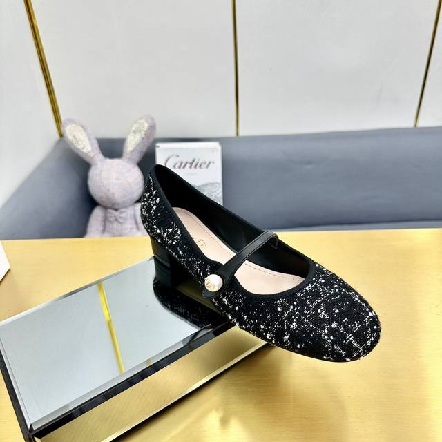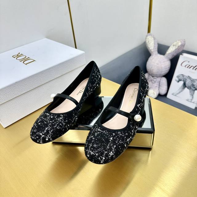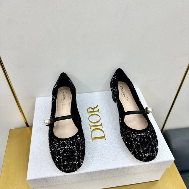迪奥 Dior 2024春夏高定系列新款 Ballet 标志性电绣藤格纹低跟芭蕾舞女鞋 Cd字母logo珍珠扣粗跟蝴蝶结凉鞋