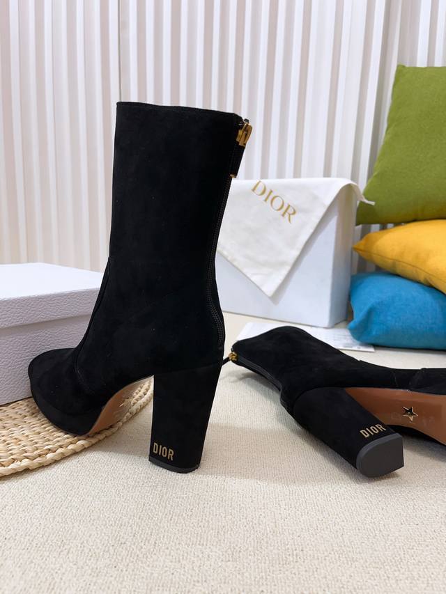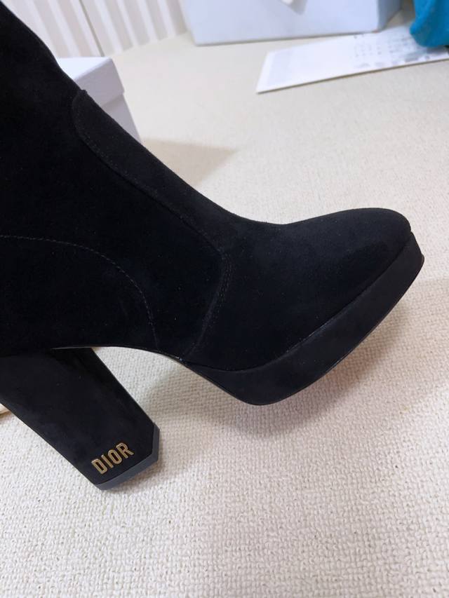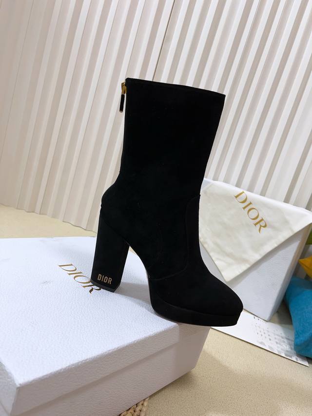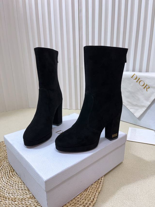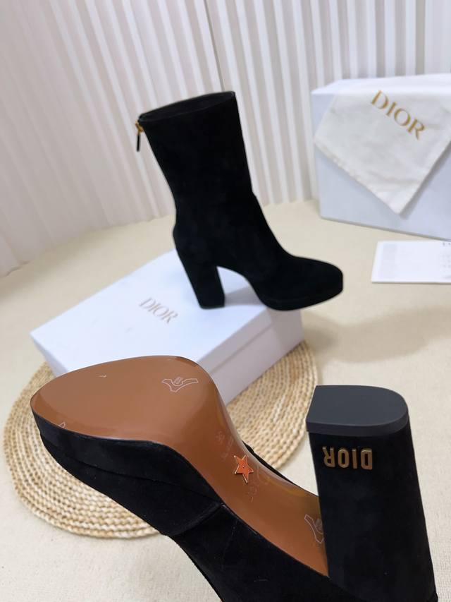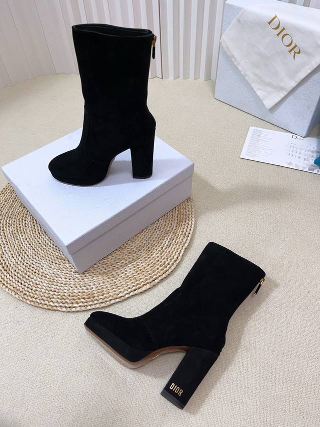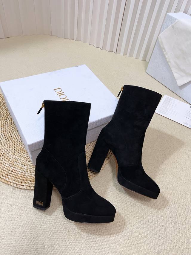 Cd字母Logo五金扣 圆头后拉链高跟防水台骑士女靴