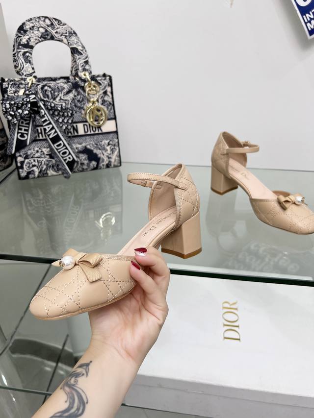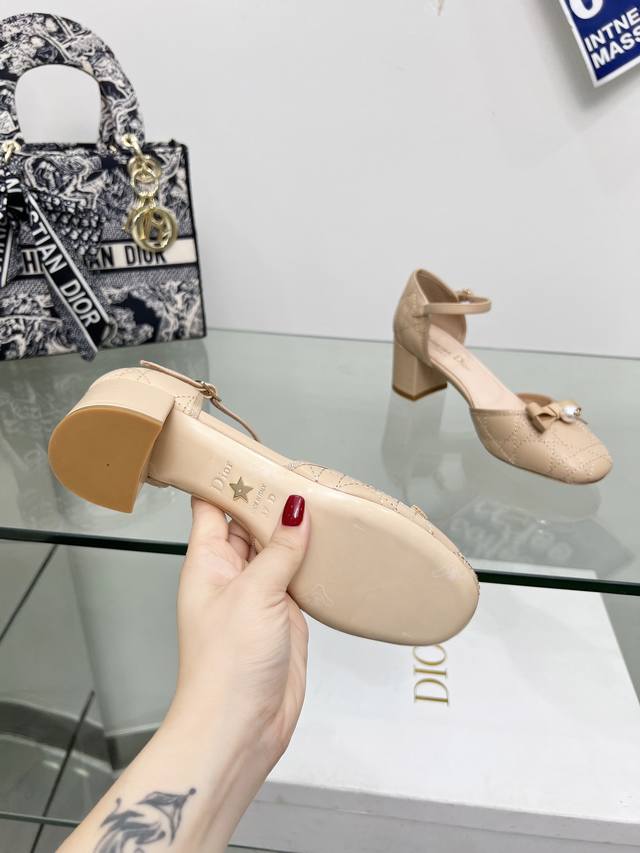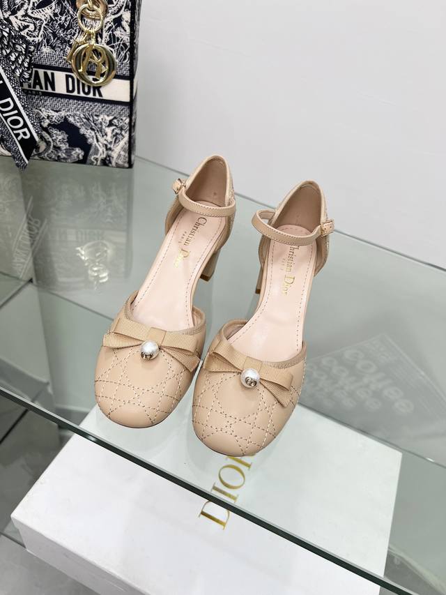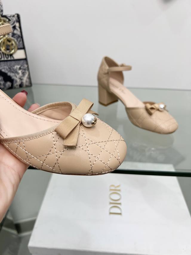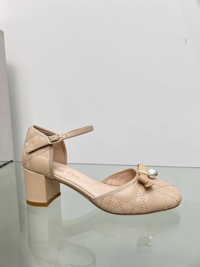 迪奥 Dior 2024春夏高定系列新款 Ballet 标志性电绣藤格纹低跟芭蕾舞女鞋 Cd字母logo珍珠扣粗跟蝴蝶结凉鞋