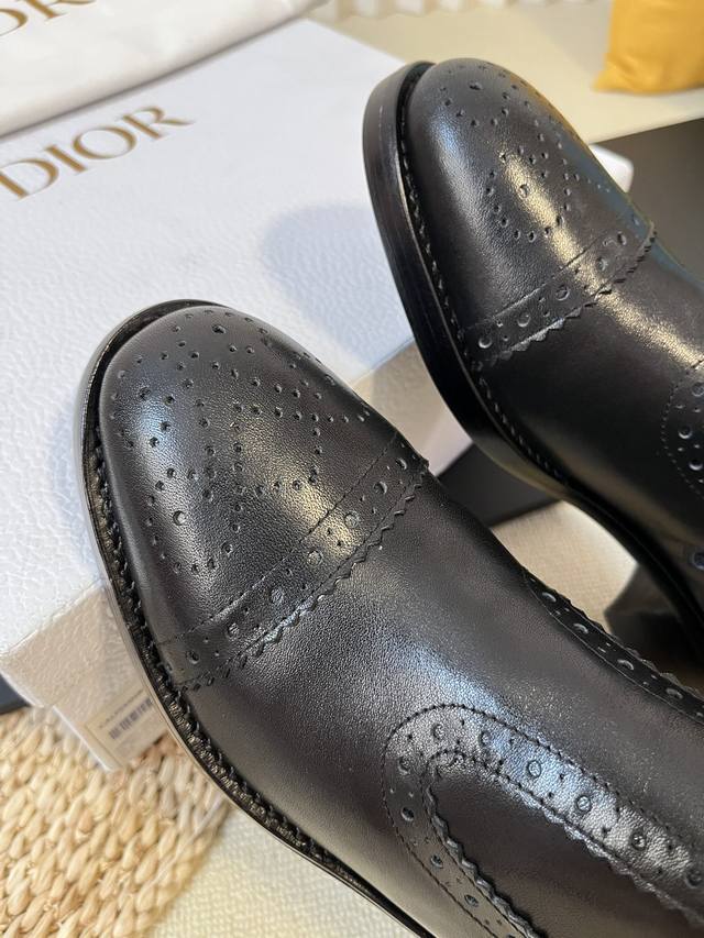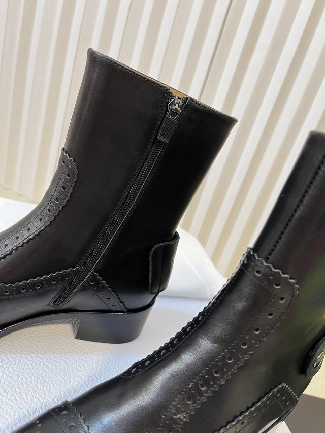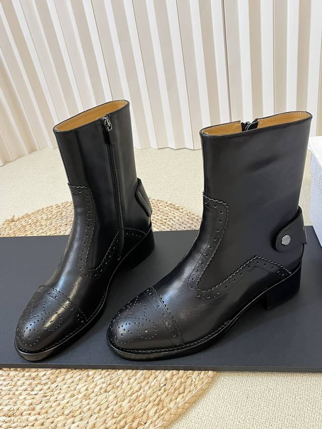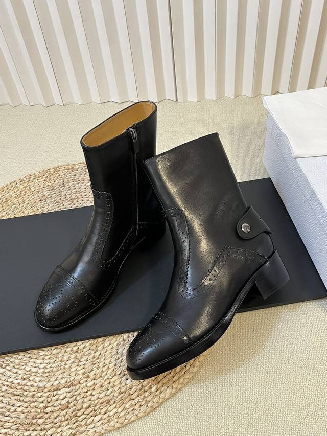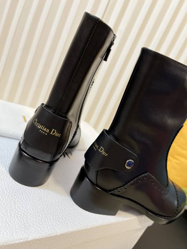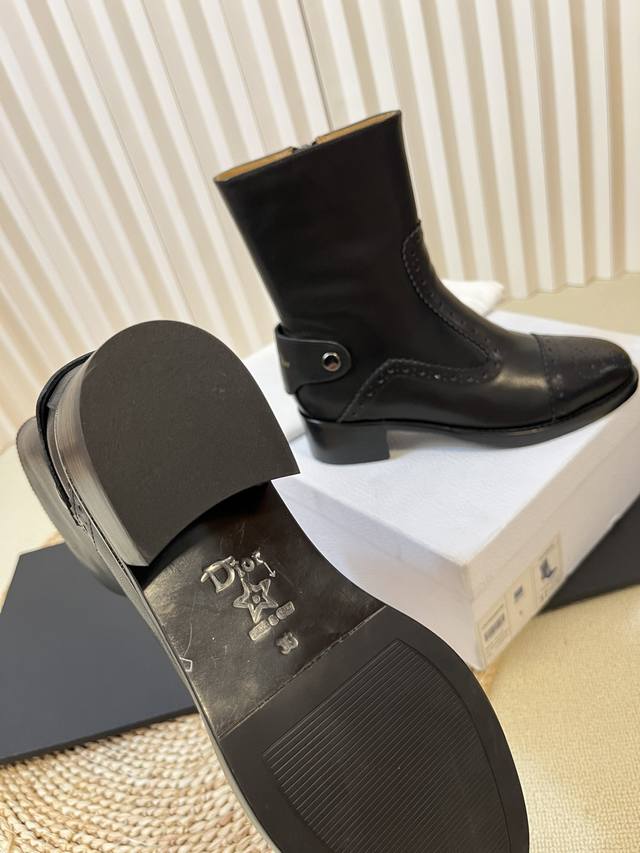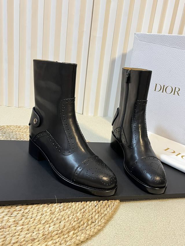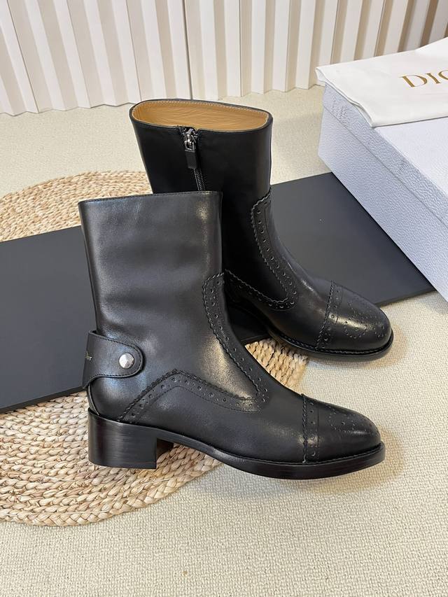 出厂: Dio.R迪奥2025秋冬切尓西新款走秀高定系列D-Folk后拉链女短靴 布洛克雕花优雅高贵明星同款粗跟圆头一脚蹬长靴骑士靴 市面顶级版本,侧边拉链带弹