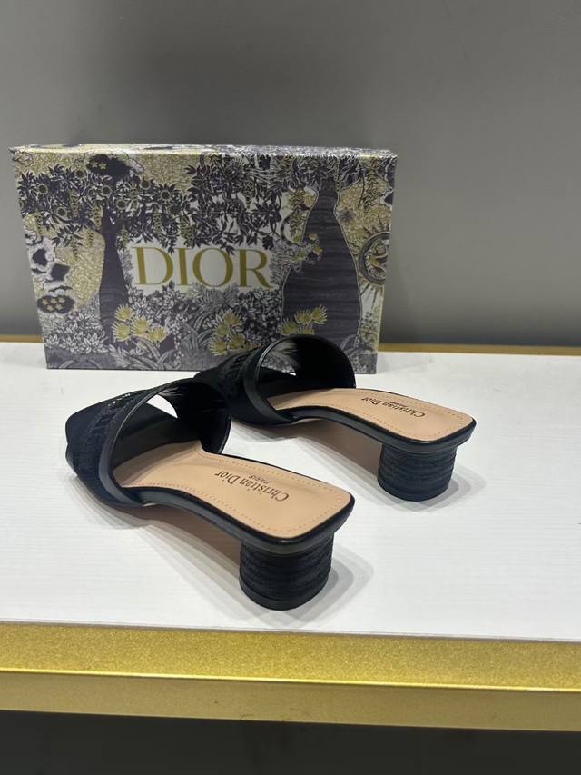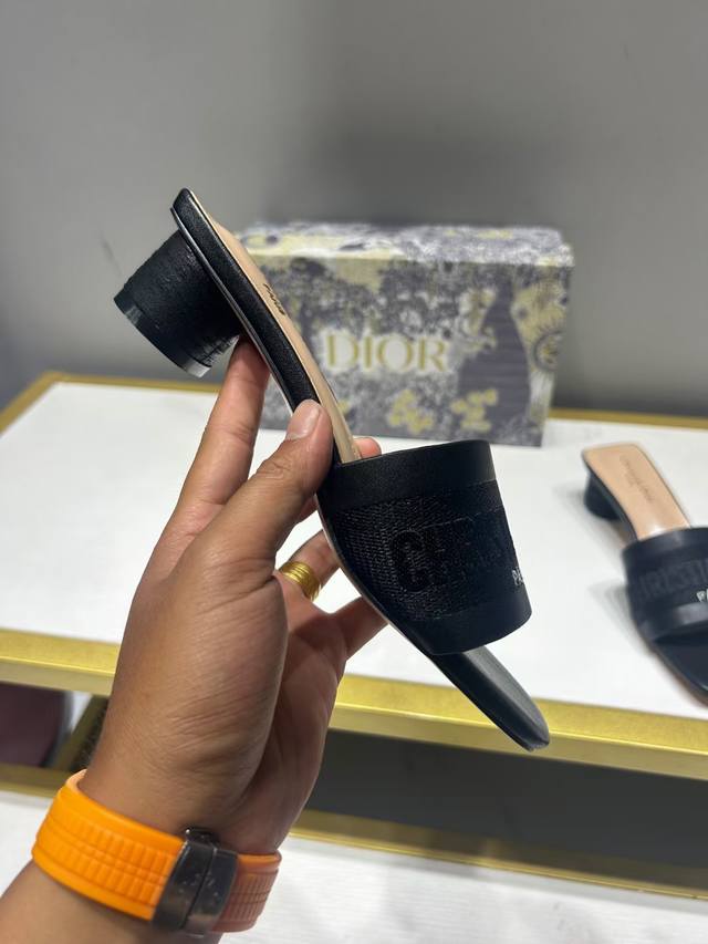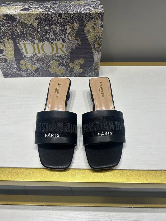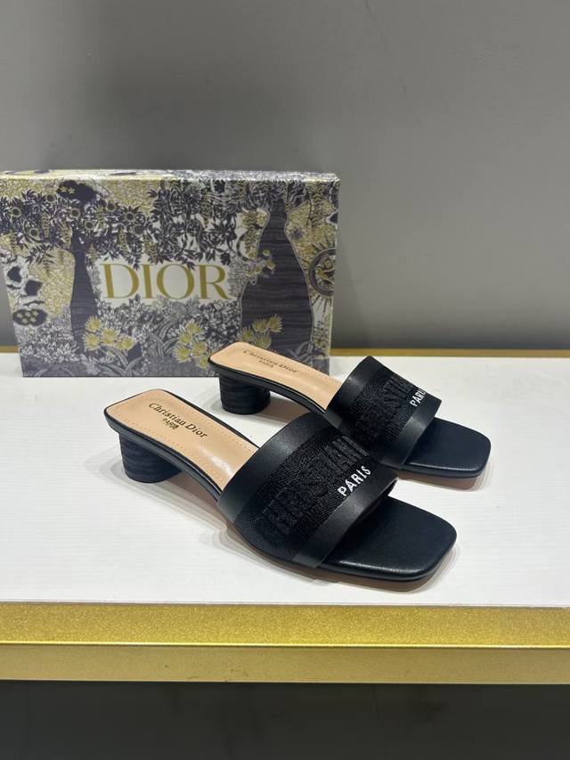 Dior 迪奥 2024夏季新款 刺绣字母水钻方头粗跟拖鞋 高跟凉拖