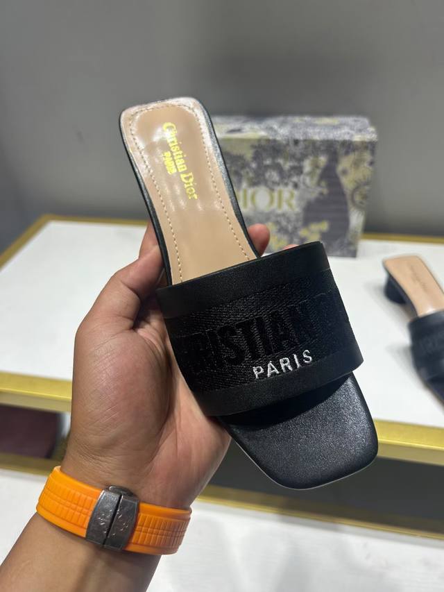 出厂: Dior 迪奥 2024夏季新款 刺绣字母水钻方头粗跟拖鞋 高跟凉拖 跟高:5Cm 码数:35-41