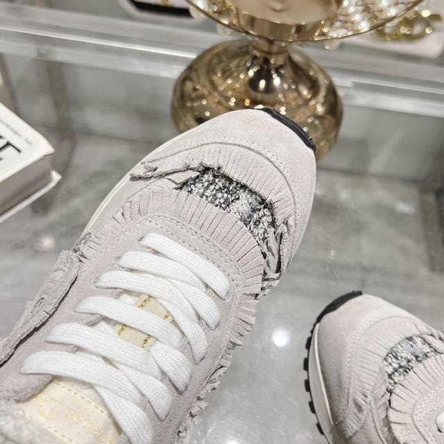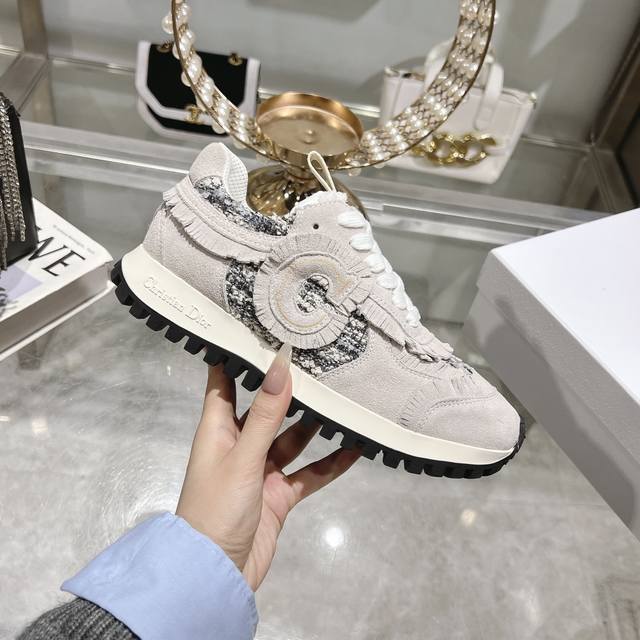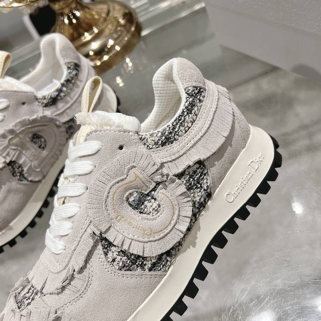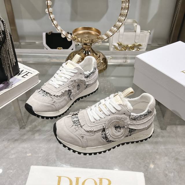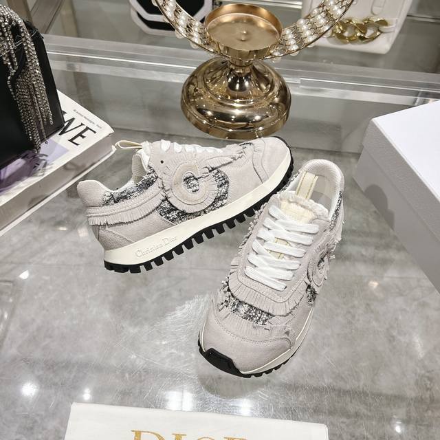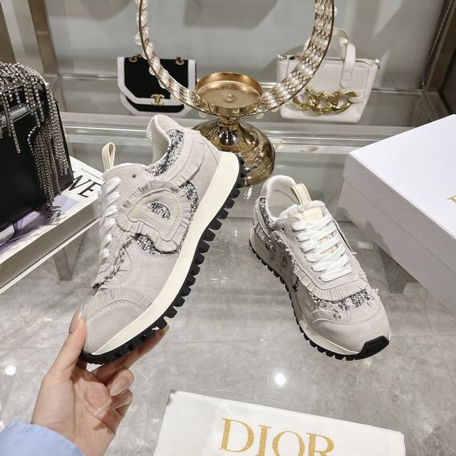 出厂 Est Dior 迪奥 25早春新款全新休闲运动鞋‘以绒面牛皮革和网眼织物制作,轻盈透气 还有满钻款哟 各有特色各有不同的穿搭 侧边的cd字母非常有dior辩识度,运动风设计融合流苏细节也增添了一丝优雅气质 原版面料复杂拼接 原版大底 码数:35-40