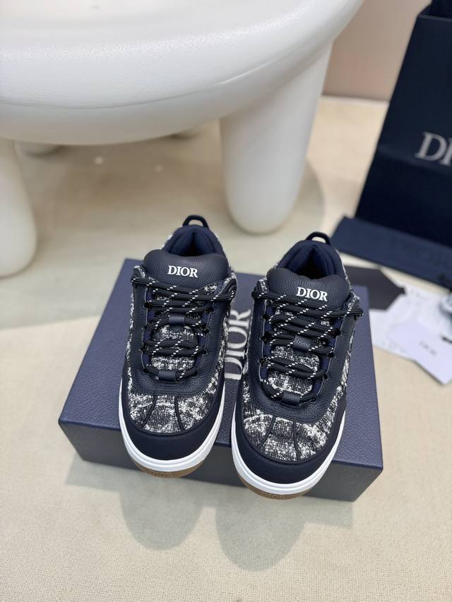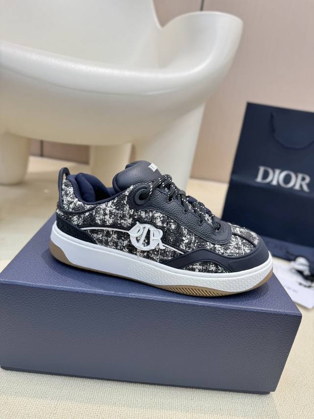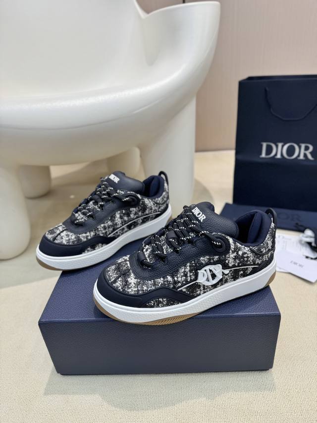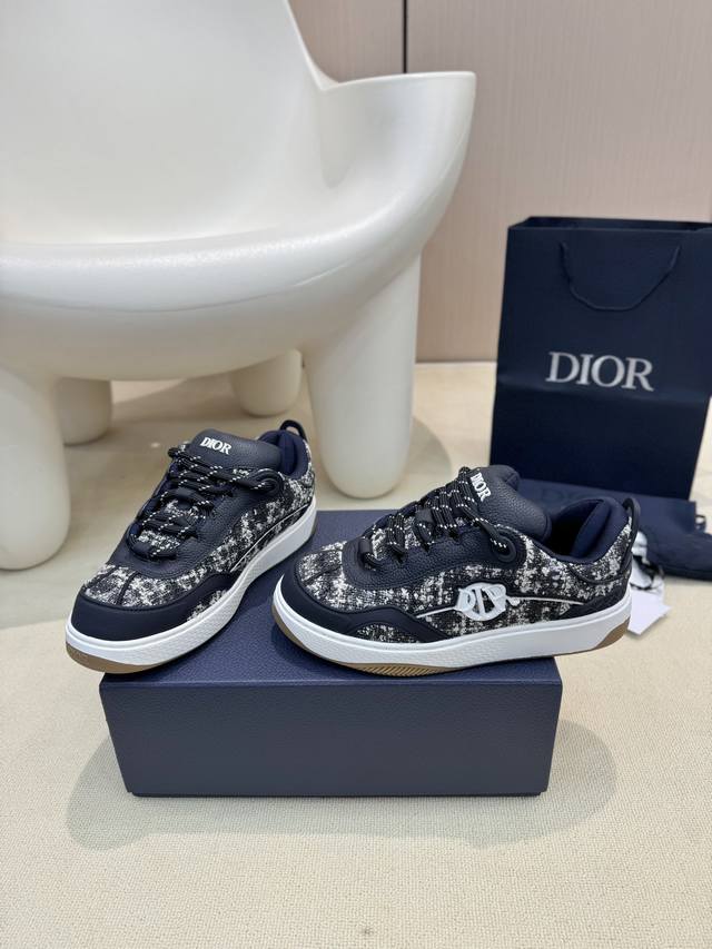 原版购入开发做货 这款全新 B9S 滑板运动鞋的灵感源自滑板运动和 Dior 的高订精神。采用海军蓝色棉质粗花呢精心制作,重新演绎经典的藤格纹图案,展示粒面牛皮革细节,向 Dior 的精湛工艺致敬。加垫鞋舌和科技面料袜筒,打造理想的舒适穿着体验。设计处处可见经典细节,例如鞋跟和鞋舌的 Dior 标志、藤格纹图案的镶片,以及灵感源自 Dior 标识的侧面橡胶 Dior Charm 标志。搭配镌刻以渐变效果 Obl