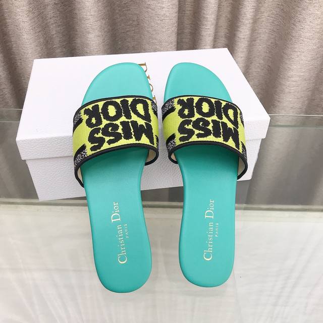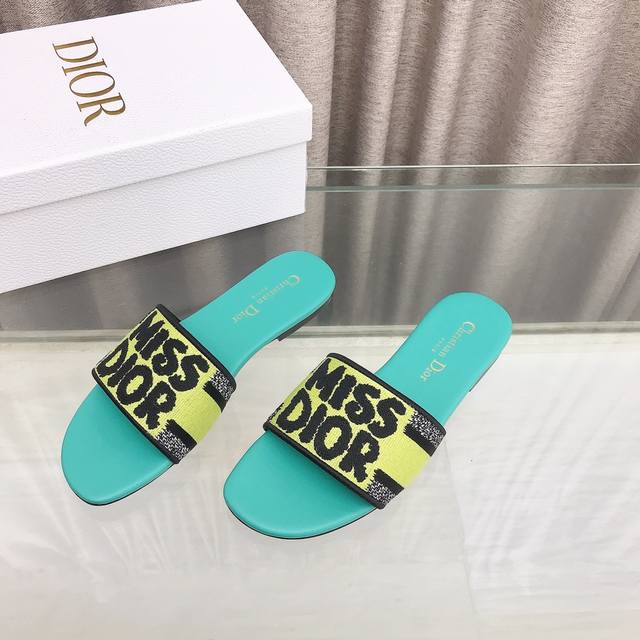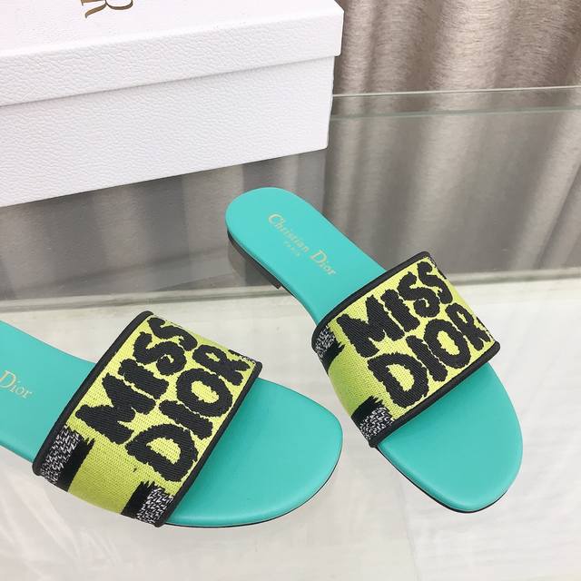 迪奥 Dior 新元素miss Dior 春夏新款一字拖拼色女鞋 Cd字母logo立体刺绣圆柱跟凉鞋 方头粗跟果冻色露趾拖鞋 市面顶级版本