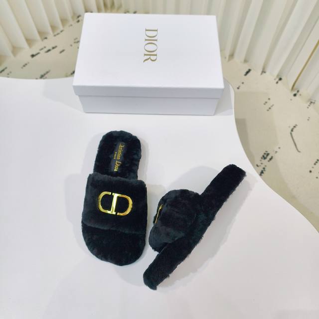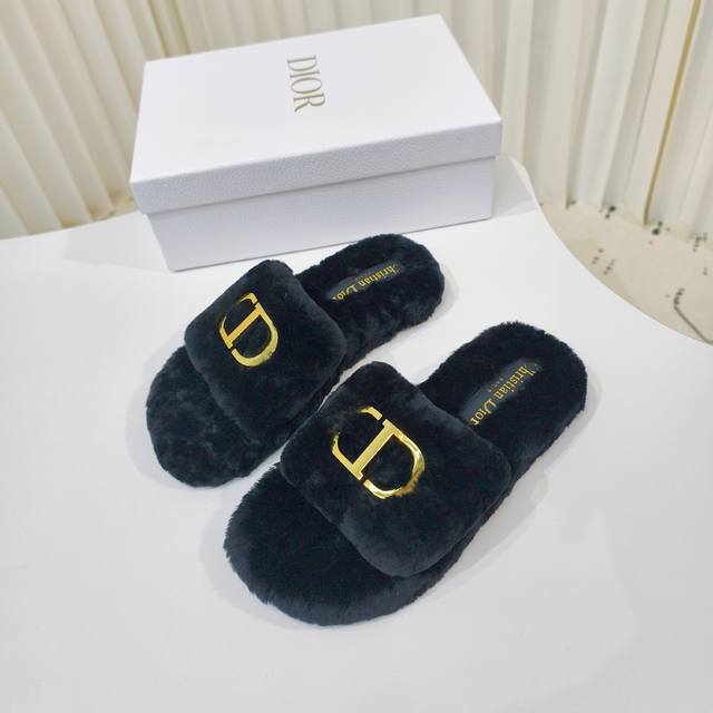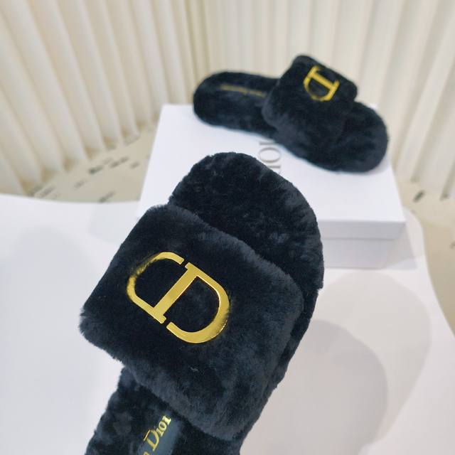 24Ss新款dior迪奥cd纯铜金属扣毛毛鞋一字厚底羊毛拖鞋