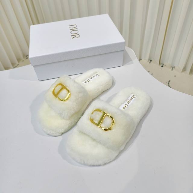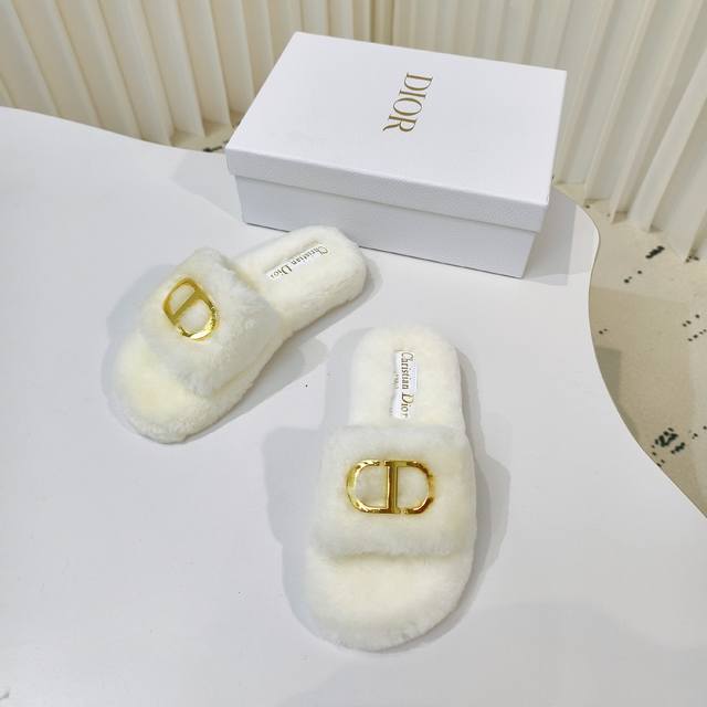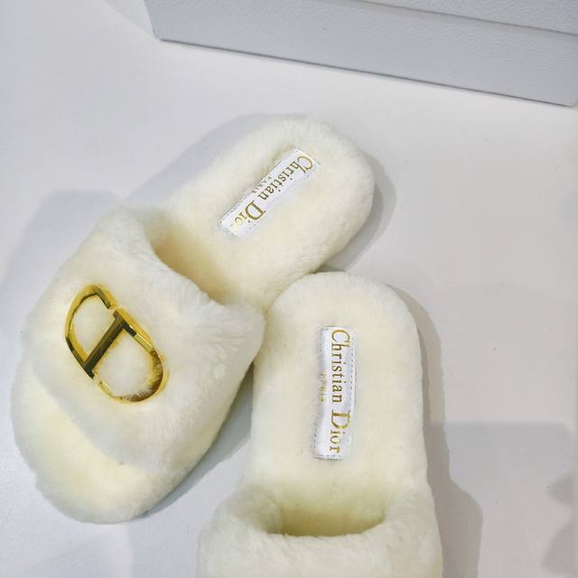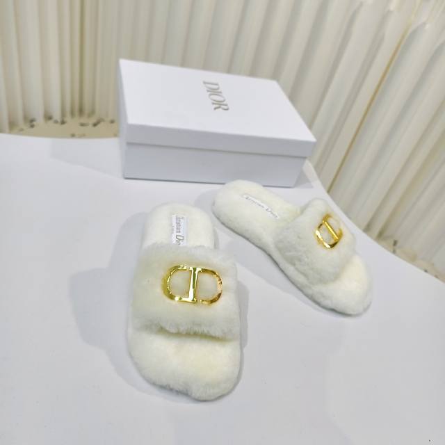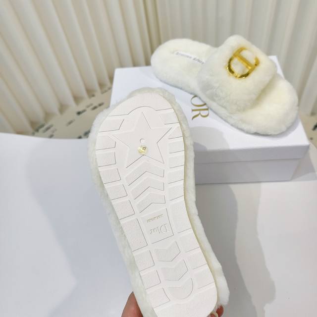 24Ss新款dior迪奥cd纯铜金属扣毛毛鞋一字厚底羊毛拖鞋