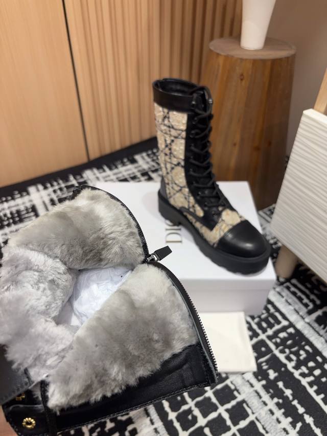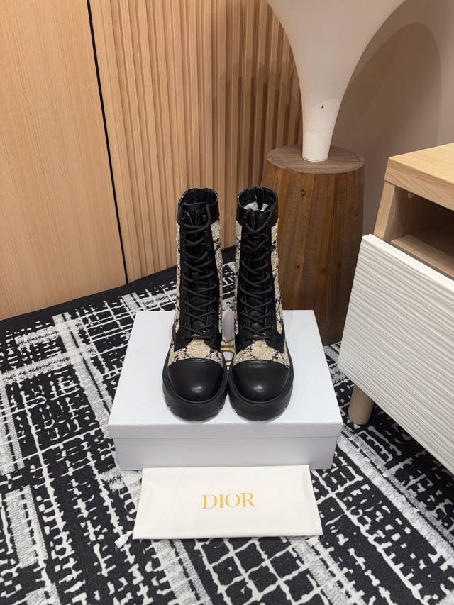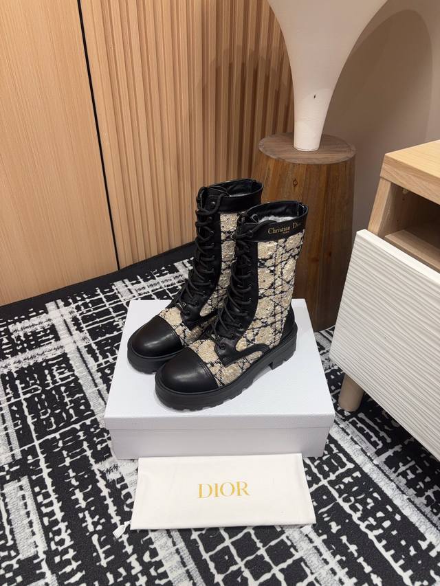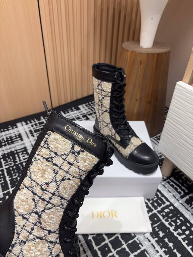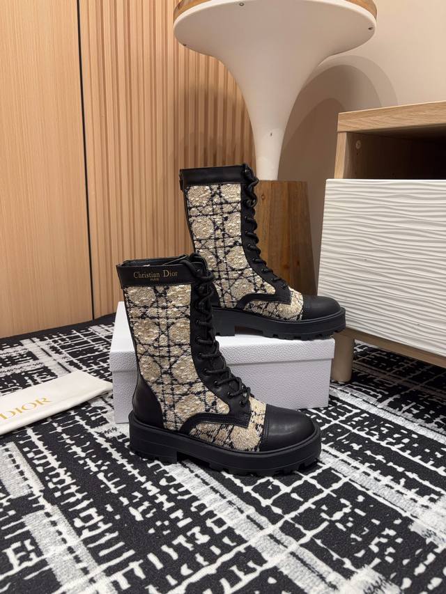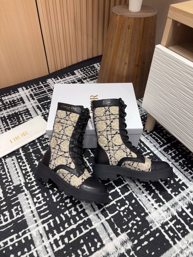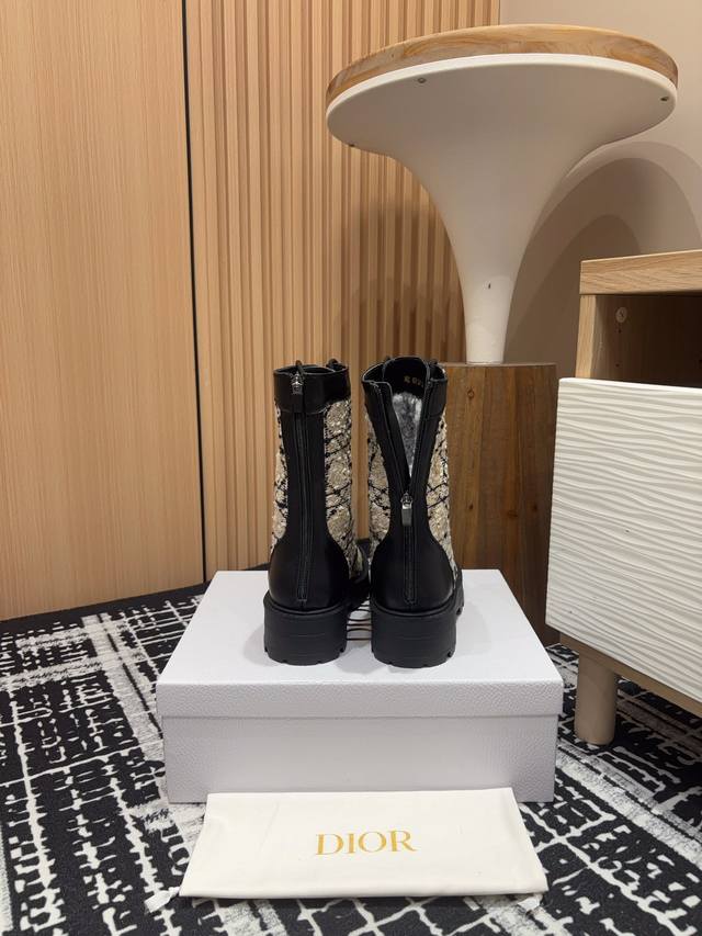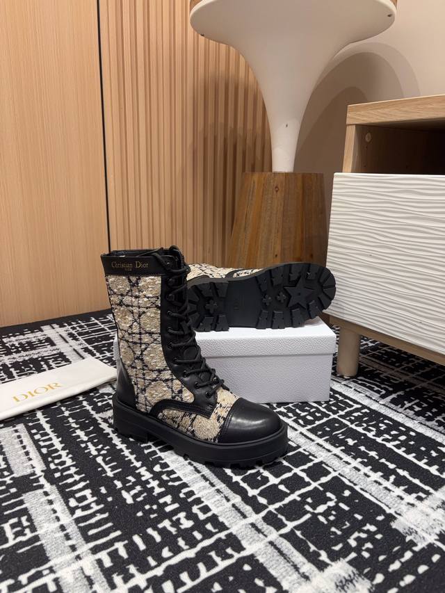 这款 D-Unit 及踝靴醒目时尚 融合黑色牛皮革与米色和黑色藤格纹粗花呢等材质,侧面饰以金色调 Christian Dior Paris 标志提升格调 厚实而柔软轻盈的纹理 Eva 凹口鞋底令这款时尚及踝靴更显精致