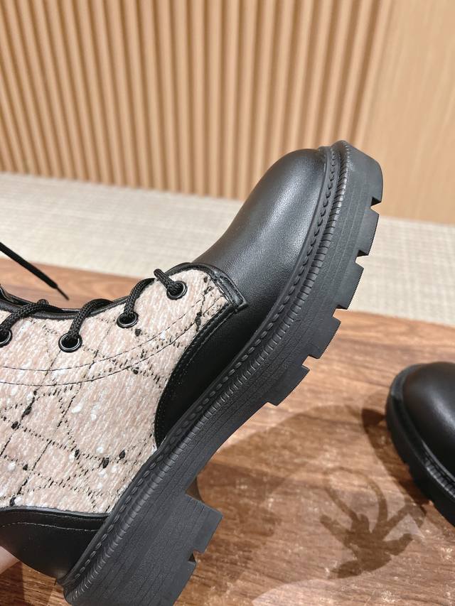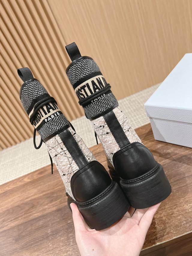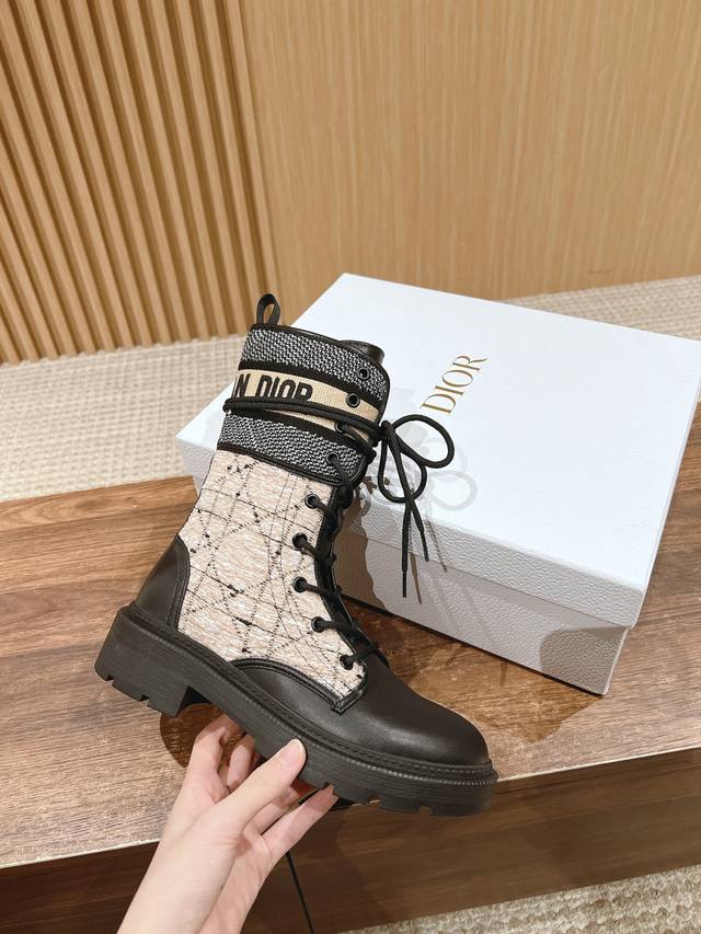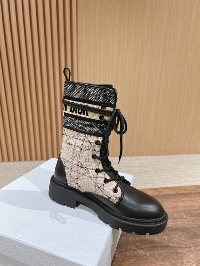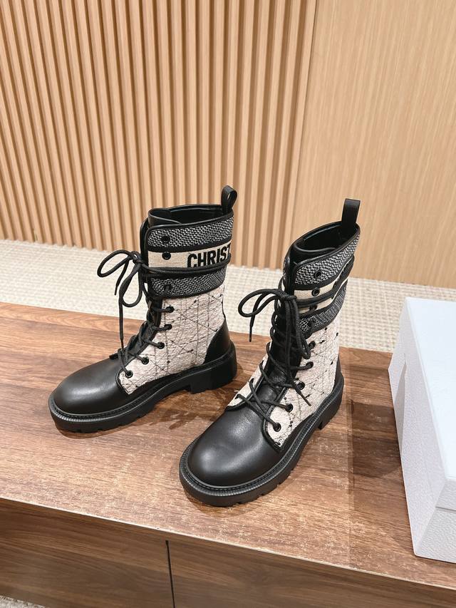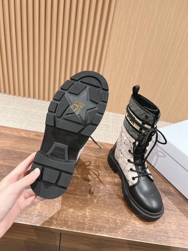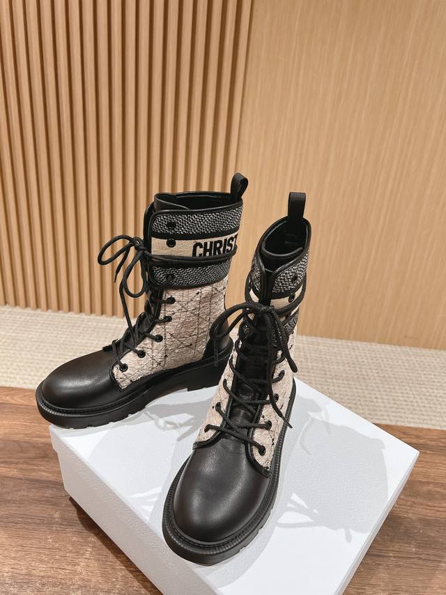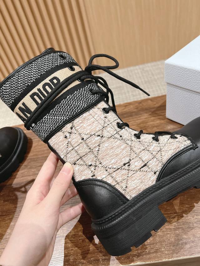 靴筒饰有“Christian Dior”标志 踝部以科技面料饰带环绕,搭配黄铜饰环