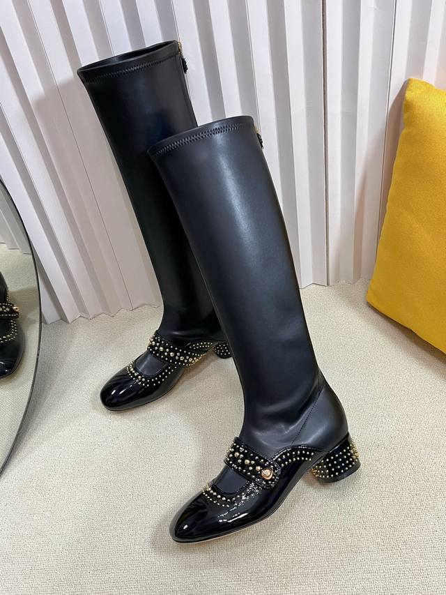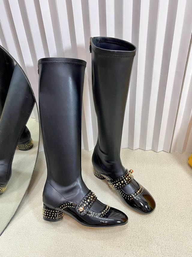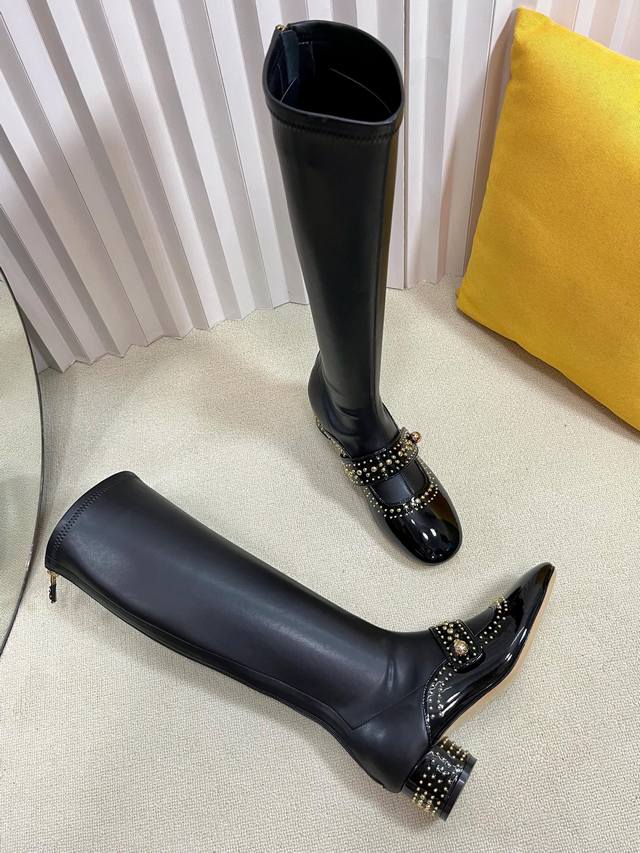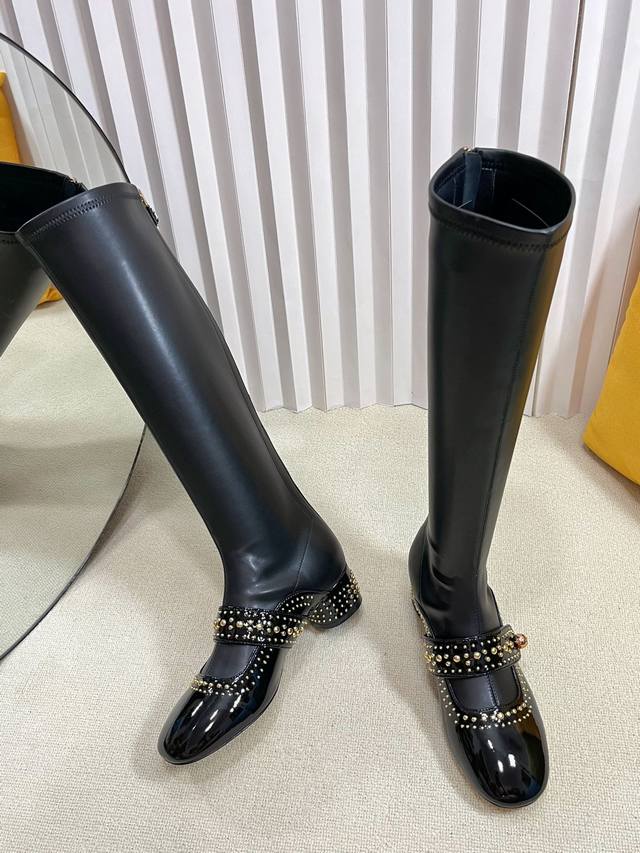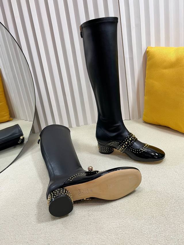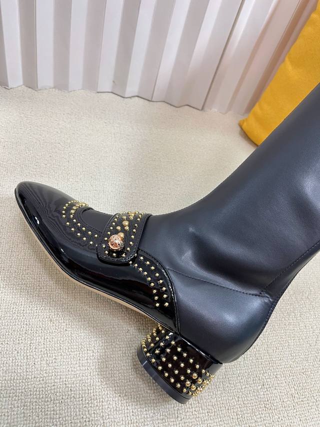 Dior 迪奥 25秋冬新款Belle-D朋克风格铆钉粗跟弹力高筒骑士女长靴 明星同款Cd字母Logo五金扣方头拼色后拉链低跟机车短靴