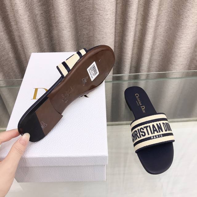 迪奥 Dior 春夏新款 Dway 平底一字拖拼色女鞋 Cd字母logo立体刺绣圆头露趾凉拖鞋 原版开发市面顶级版本 鞋面:进口酒椰草电绣高温水溶棉质科技面料