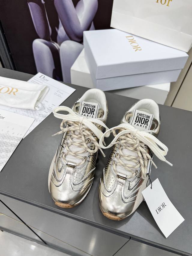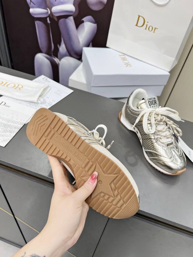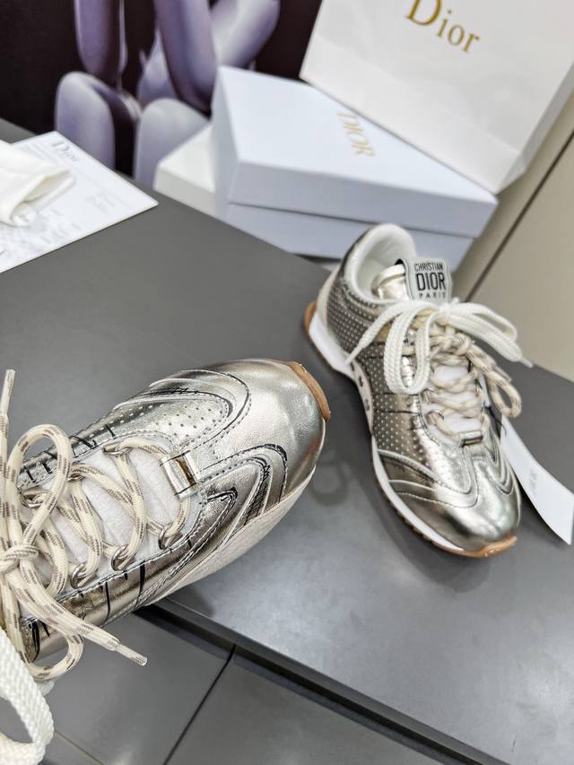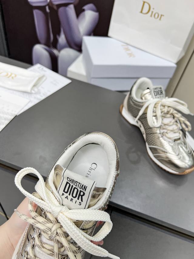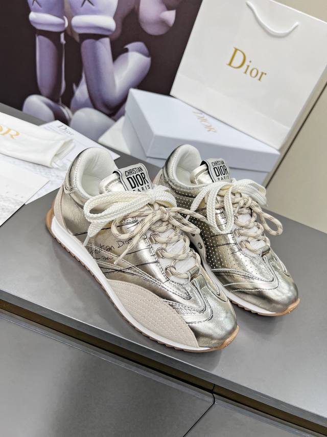 款 D-Sketch运动鞋是二零二五春夏成衣系列新品,彰显经典的复古美学。采用金色调褶皱羊皮革和金色调叠层牛皮革等材质精心制作,,搭配米色绒面牛皮革镶片和双鞋带。侧面饰以手写风格的Christian Dior paris标志,鞋跟和鞋舌点缀以Christian Dior paris 标志镶片和标牌。搭配双色纤薄橡胶鞋底更显精致
