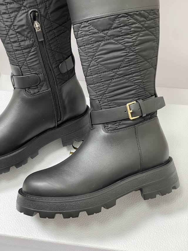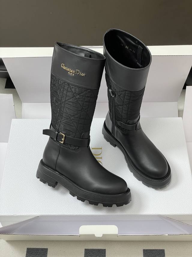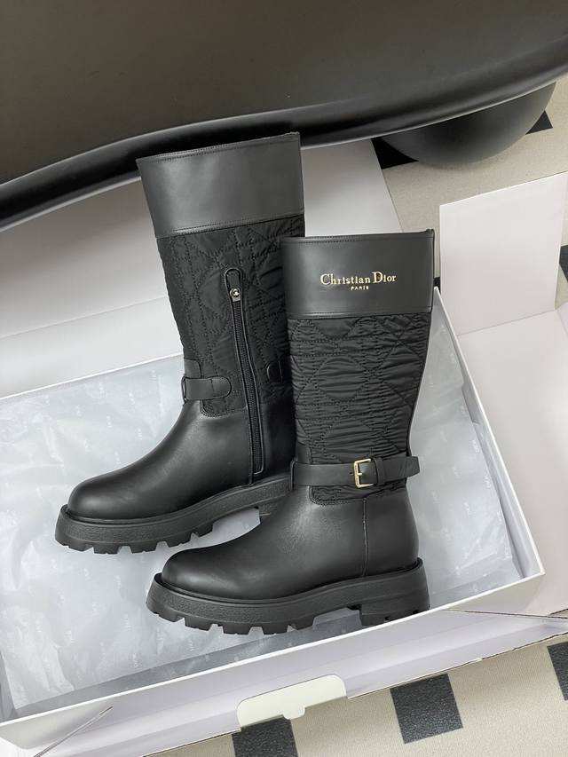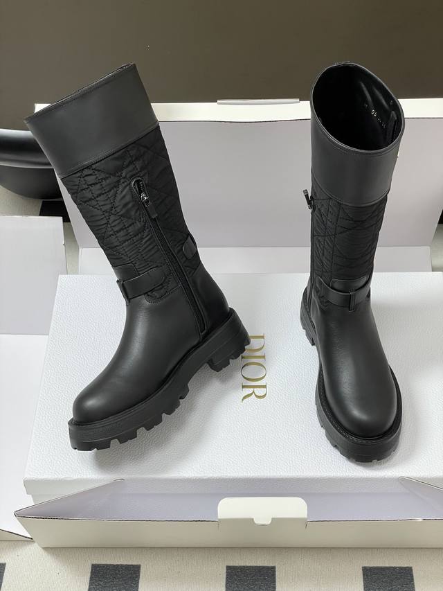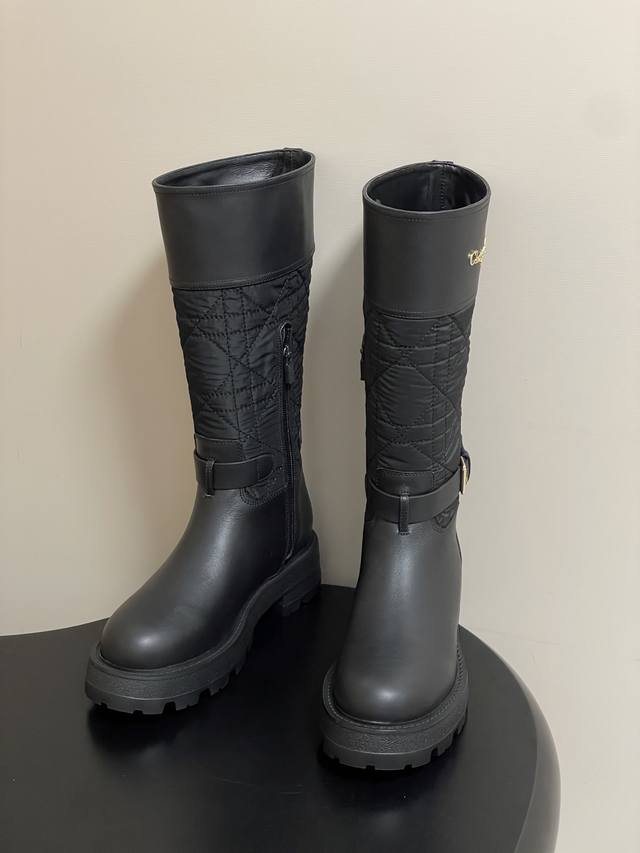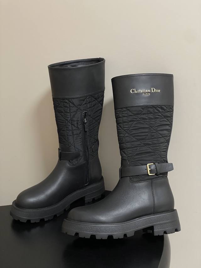 2025秋冬新款Dior迪奥D-Town 靴子黑色牛皮革和尼龙搭配藤格纹图案刺绣中筒骑士靴经典Cd字母扣布面一脚蹬直筒长靴
