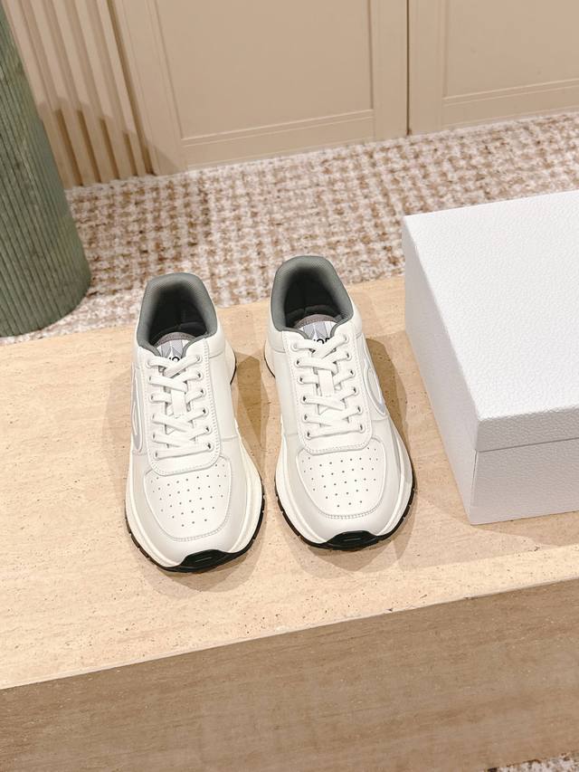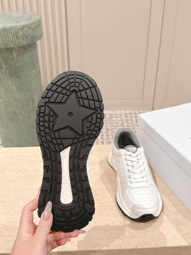 原版购入开发 做货 这款 Run'n'dior 运动鞋是二零二五秋季系列新品,以优雅时尚的造型重新演绎运动风格。鞋面采用白色网眼织物精心制作,鞋带和鞋跟饰以 Christian Dior paris 标志。精致的双色鞋底轻盈柔软,可为各式休闲造型增添高订气质