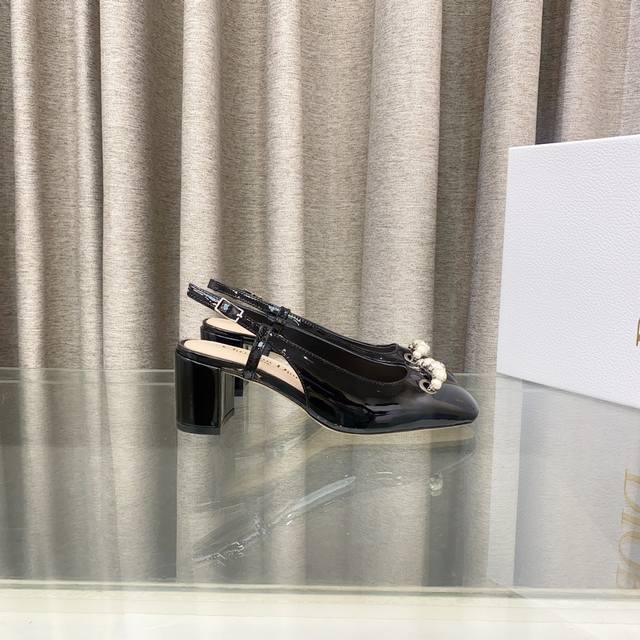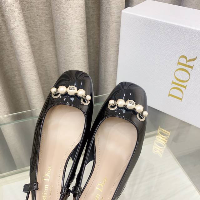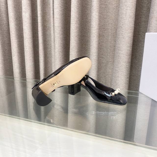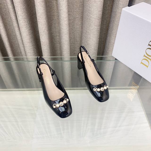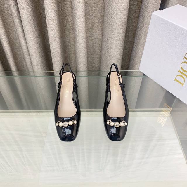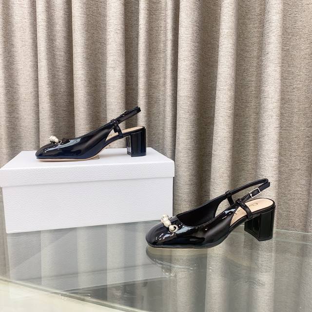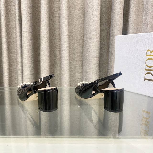 25Ss早春新款迪奥Dior Paris 露跟高跟鞋Cd珍珠扣粗跟后空凉鞋